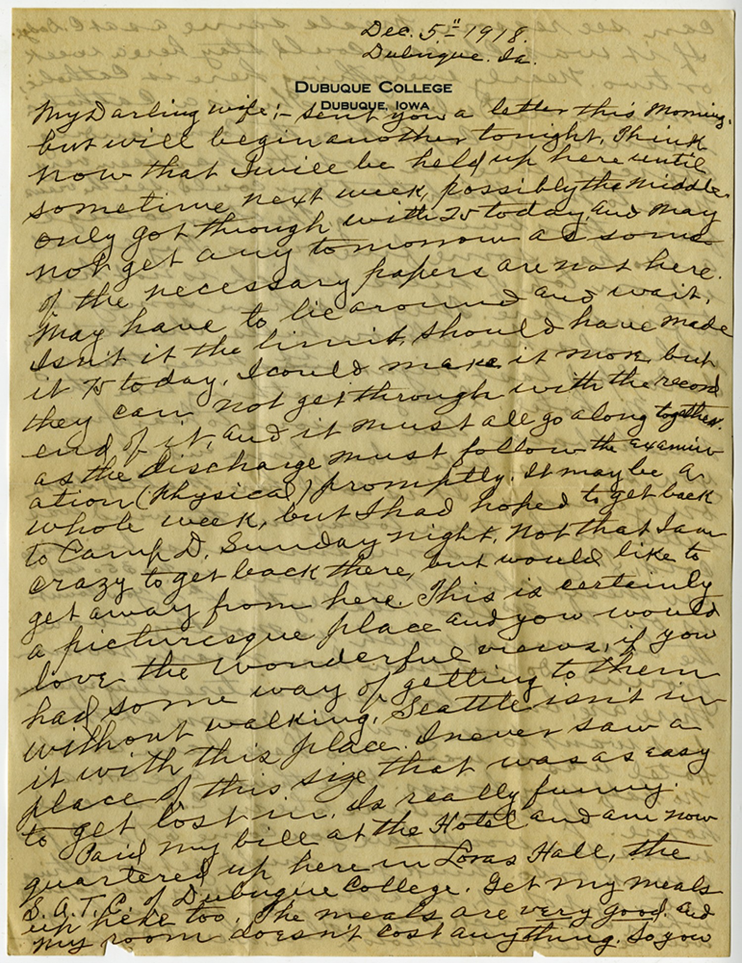 [Dubuque College Dubuque, Iowa letterhead] [December] 5, 1918 Dubuque, [Iowa]. My darling wife:- Sent you a letter this morning, but will begin another tonight. Think now that I will be held up here until sometime next week, possibly the middle. Only got through with 25 today and may not get any tomorrow as some of the necessary papers are not here. May have to lie around and wait. Isn’t it the limit, should have made it 75 today. I could make it more but they can not get through with the record end of it and it must all go along together, as the discharge must follow the examination (physical) promptly. It may be a whole week, but I had hoped to get back to [Camp Dodge]. Sunday night. Not that I am crazy to get back there, but would like to get away from here. This is certainly a picturesque place and you would love the wonderful views, if you had some way of getting to them without walking. Seattle isn’t in it with this place. I never saw a place of this size that was as easy to get lost in. Is really funny. Paid my bill at the Hotel and am now quartered up here in Lovas Hall, the [Students Army Training Corp] of Dubuque College. Get my meals up here too. The meals are very good and my room doesn’t cost anything. So you