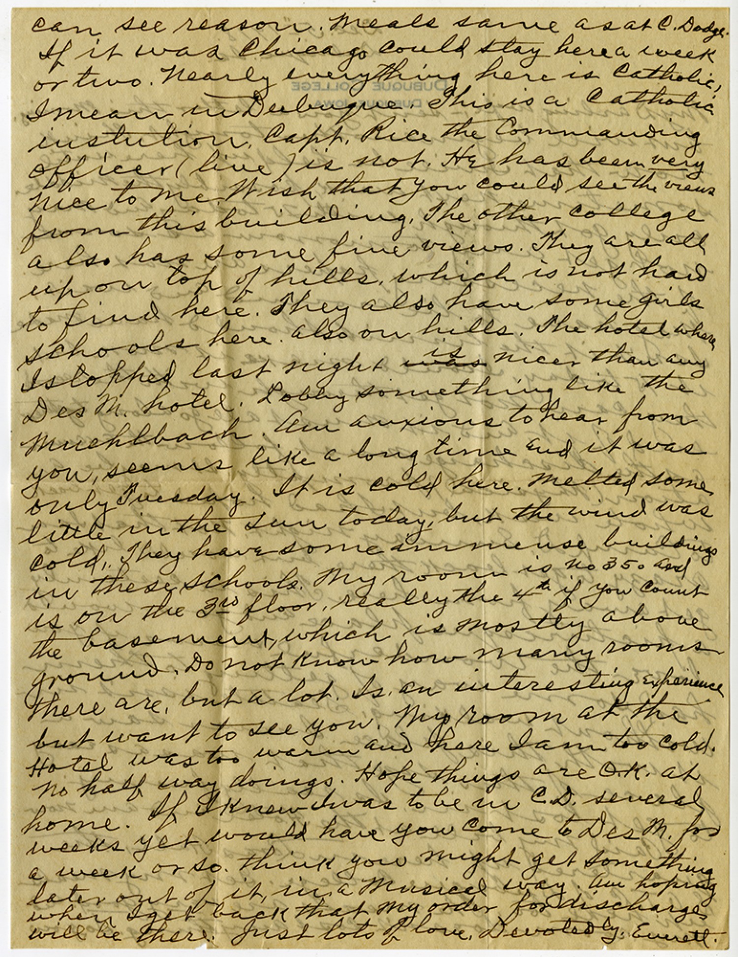 can see reason. Meals same as at [Camp Dodge]. If it was Chicago could stay here a week or two. Nearly everthing here is Catholic, I mean in Dubuque. This is a Catholic institution. Capt. Rice the Commanding officer (live) is not. He has been very nice to me. Wish that you could see the views from this building. The other college also has some fine views. They are all up on top of hills, which is not hard to find here. They also have some girls schools here. Also on hills. The hotel where I stopped last night is nicer than any [Des Moines] hotel. Lobby something like the Muehlbach. Am anxious to hear from you seems like a long time and it was only Tuesday. It is cold here. Melted some little in the sun today, but the wind was cold. They have some immense buildings in these schools. My room is no 350 and is on the 3rd floor, really the 4th if you count the basement, which is mostly above ground. Do not know how many rooms there are, but a lot. Is an interesting experience but want to see you. My room at the hotel was too warm and here I am too cold. No half way doings. Hope things are O.K. at home, If I knew I was to be in [Camp Dodge] several weeks yet would have you come to [Des Moines] for a week or so. think you might get something later out of it in a Musical way. Am hoping when I get back that my order for discharges will be there. Just lots of love. Devotedly, Everett.