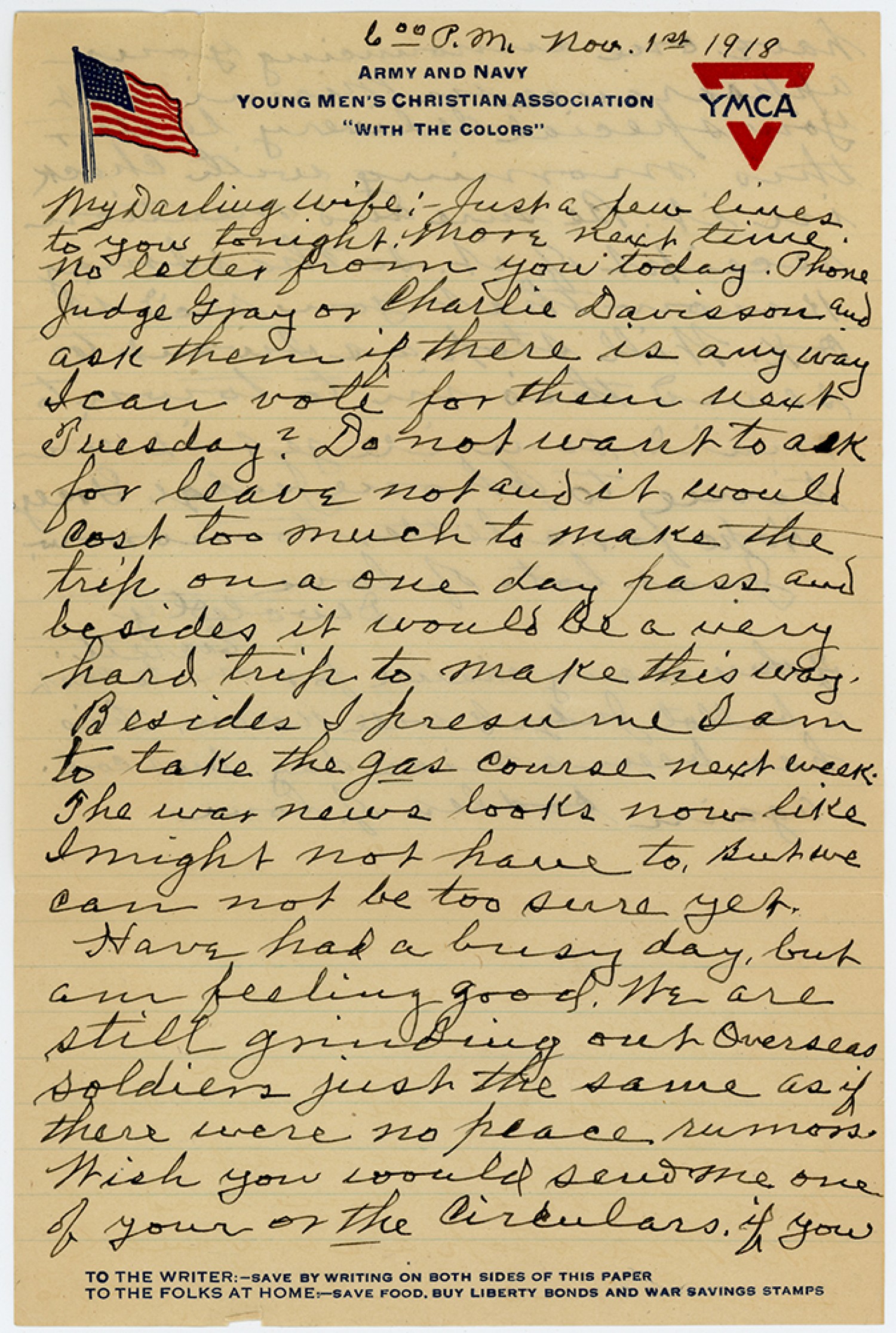 [Y.M.C.A. letterhead] 6 00 P.M. [November] 1st 1918 MyDarling Wife : - Just a few lines to you tonight. More next time. No letter from you today. Phone Judge Gray or Charlie Davisson and ask them if there is any way Ican vote for them next Tuesday? Do not want to ask for leave not and it would Cost too much to make the trip on a one day pass and besides it would be a very hard trip to make this way. Besides I presume Iam to take the gas course next week. The war news looks now like Imight not have to, But we Can not be too sure yet. Have had a busy day, but am feeling good. We are still grinding out Overseas soldiers just the same as if there were no peace rumors. Wish you would send Me one of your or the Circulars. if you
