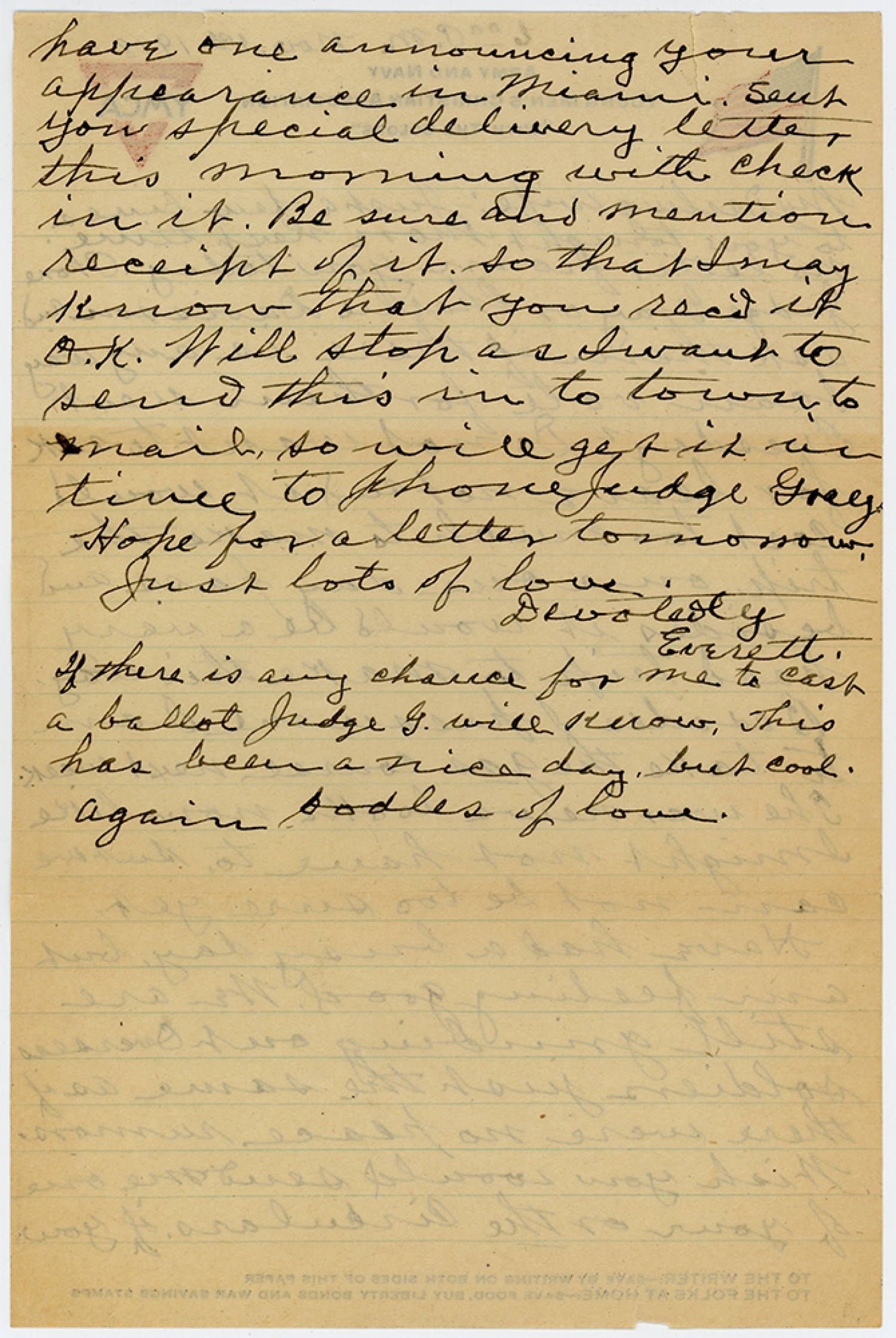 have one announcing your appearance in Miami. Sent you special delivery letter this morning with Check in it. Be sure and mention receipt of it, so that Imay Know that you rec’d it O.K. Will stop as Iwant to send this in to town to mail, so will get it in time to phone Judge Gray Hope for a letter tomorrow. Just lots of love. Devotedly Everett. If there is any Chance for me to Cast a ballot Judge G. will know. This has been a nice day, but Cool. Again Oodles of love.