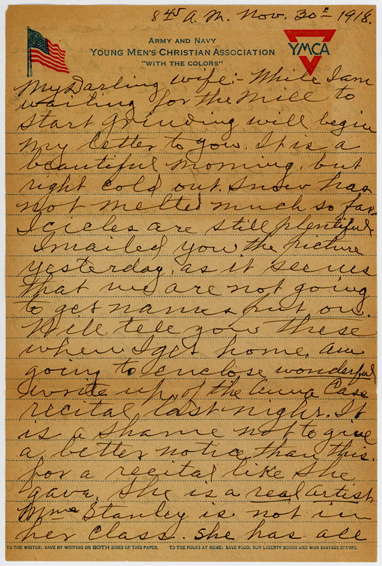 [American Y. M. C. A. letterhead] 8:45 A.M. [November] 30th 1918. My Darling Wife:- While Iam waiting for the mill to start grinding will begin my letter to you. It is a beautiful morning but right cold out snow has not melted much so far. Icicles are still plentiful. I mailed you the picture yesterday as it seems that we are not going to to get names on. Will tell you these when I get home, am going to enclose wonderful write up of the Anna Case recital last night. It is a shame not to give a better notice than this for a recital like she gave, she is a real artist, Mme Stanley is not in her class. She has all