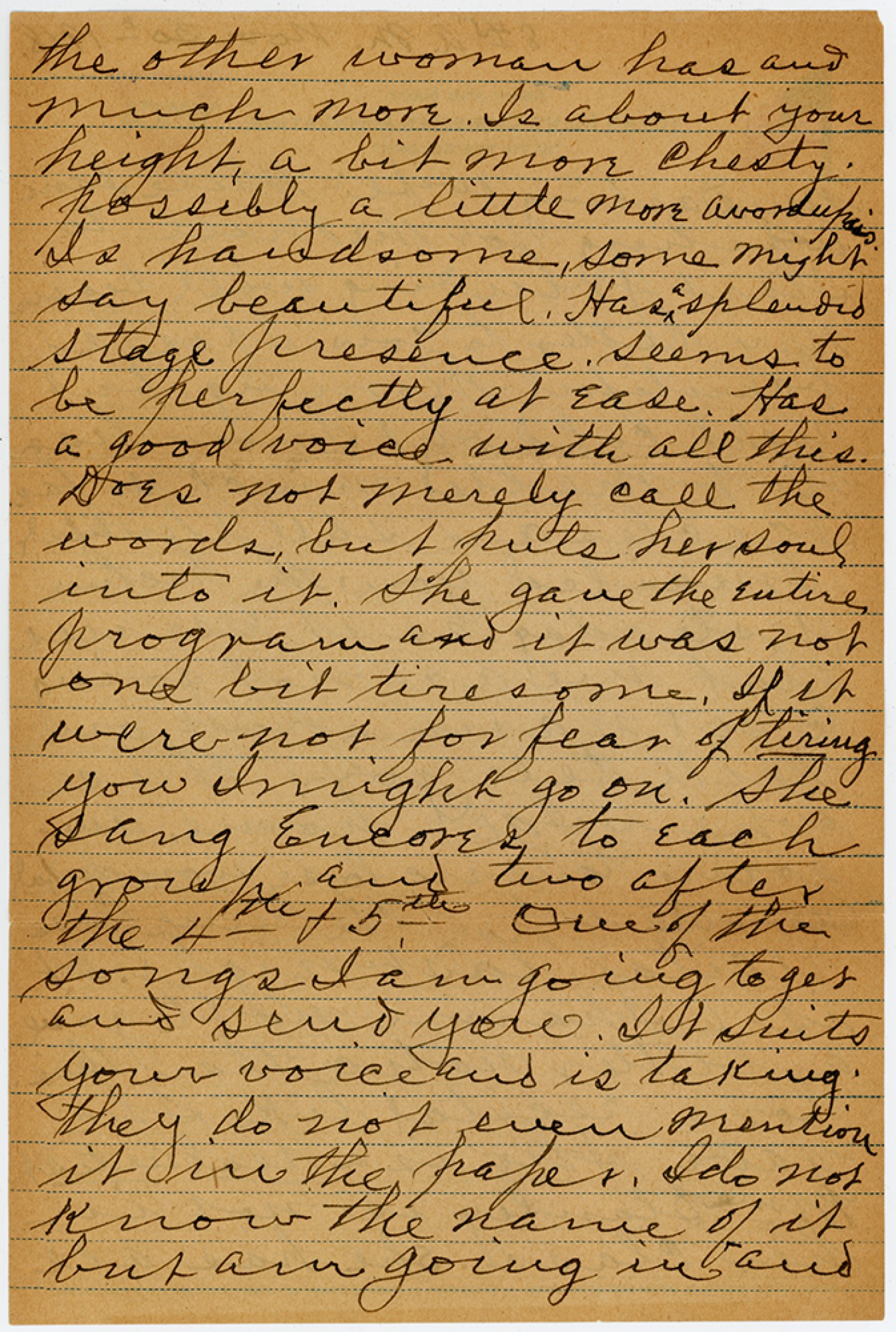 the other woman has and much more. Is about your height, a bit more chesty; possibly a little more [MS Illegible: 1 word]. Is handsome, some might say beautiful. Has a splendid stage presence. Seems to be perfectly at ease. Has a good voice with all this. Does not merely call the words, but puts her soul into it. She gave the entire program and it was not one bit tiresome. If it were not for fear of tiring you I might go on. She sang Encores to each group and two after the 4th and 5th. One of the songs I am going to get and send you. It suits your voice and is taking: they do not even mention it in the paper. I do not know the name of it but I am going in and