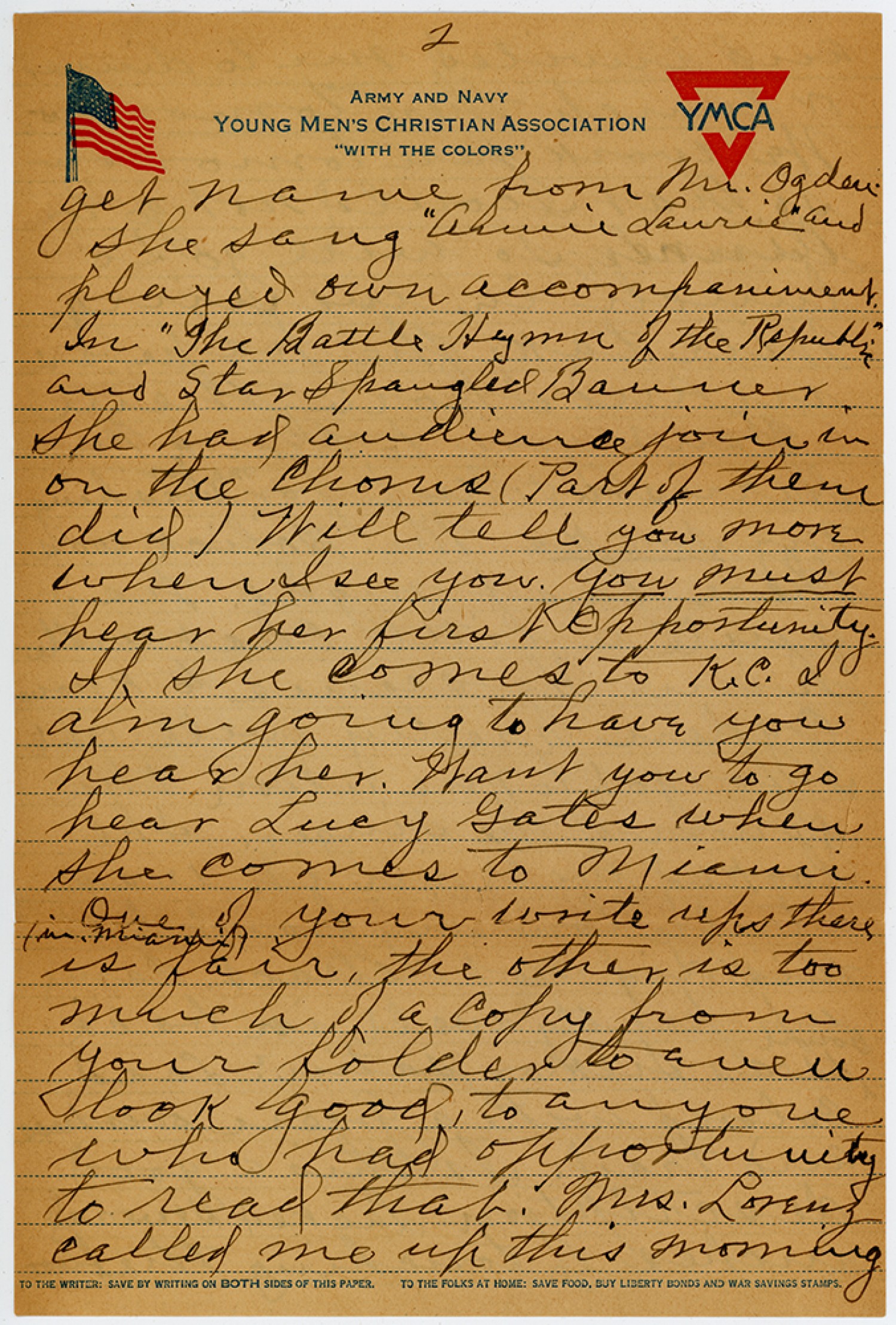 [American Y. M. C. A. letterhead] get name from Mr. Ogden. She sang “Asmire Laurie” and played own accompaniment. In “The Battle Hymn of the Republic” and Stars Spangled Banner, she had audience join in on the chorus (part of them did) Will tell you more when I see you. You must hear her first opportunity. If she comes to K. C. I am going to have you hear her. Want you to go hear Lucy Gates when she comes to Miami. One of your write ups there (in Miami) is fair, the other is too much of a copy from you folder to even look good, to anyone who had opportunity to read that. Mrs. Lorenz called me up this morning