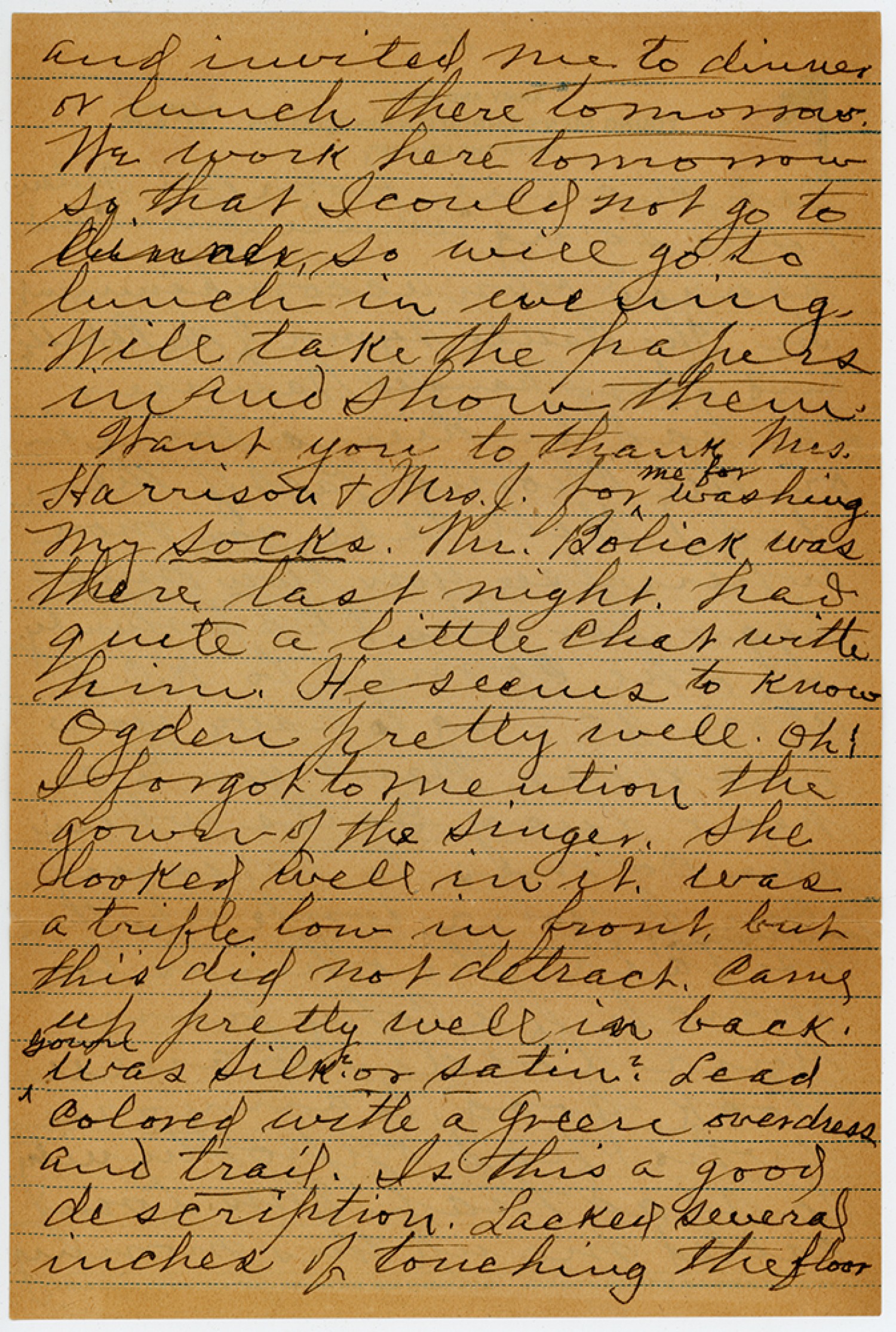 and invited me to dinner or lunch there tomorrow. We work here tomorrow so that I could not go to dinner, so will go to lunch in evening. Will take the papers in and show them. Want you to thank Mrs. Harrison and Mrs. J. for me for washing my socks. Mr. Bolick was there last night had quite a little chat with him. He seems to know Ogden pretty well. Oh; I forgot to mention the gown of the singer. She looked well in it. Was a trifle low in the front but this did not detract. Came up pretty well in back. Gown was silk or satin? Lead color with a green overdress and trail. Is this a good description. Lacked several inches of touching the floor