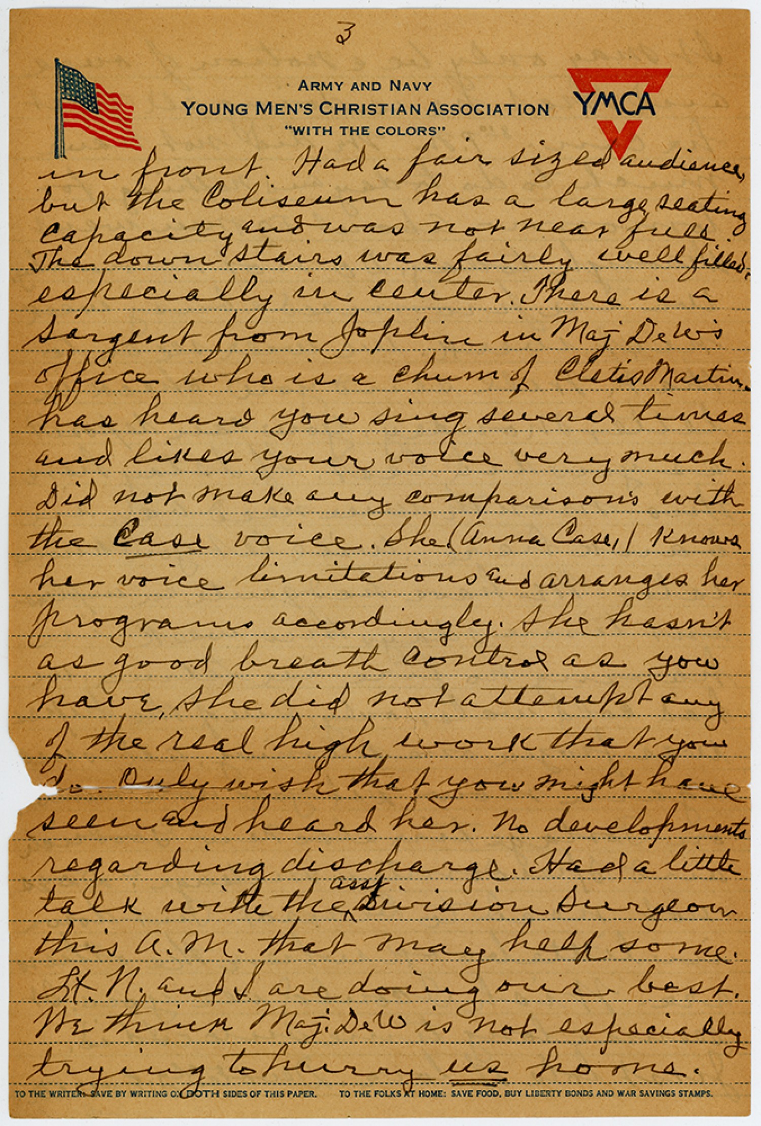 [American Y. M. C. A. letterhead] in front. Has a fair sized audiences, but the Coliseum has a large seating capacity and was not near full. The down stairs was fairly well filled especially in center. There is a Sergent from Joplin in Maj. DeW’s office who is a chum of Cletis Martin has heard you sing several times and likes your voice very much. Did not make any comparisons with the Case voice. She (Anna Case) knows her voice limitations and arranges her programs accordingly. She hasn’t as good breath control as you have, she did not attempt any of the real high work that you do. Only wish that you might have seen and heard her. No developments regarding discharge. Has a little talk with the asst. Division Surgeon this A. M. that may help some. Lt. N. and I are doing our best. We think Maj. DeW is not especially trying to hurry us home.