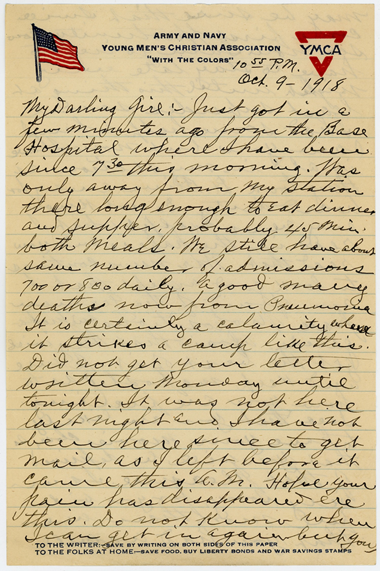 [Y.M.C.A. letterhead] 10 55 P.M. [October] 9 – 1918 MyDarling girl : - Just got in a few minutes ago from the Base Hospital where Ihave been since 7 30 this morning. Was only away from My station there long enough to Eat dinner and supper, probably 45 Min. both Meals. We still have about same Number of admissions 700 or 800 daily. A good many deaths now from Pneumonia It is certainly a calamity where it strikes a Camp like this. Did not get your letter written Monday until tonight. It was not here last Night and Ihave not been here since to get Mail, as I left before it Came this A.M. Hope your pain has disappeared ere this. Do not Know when I can get in again but you