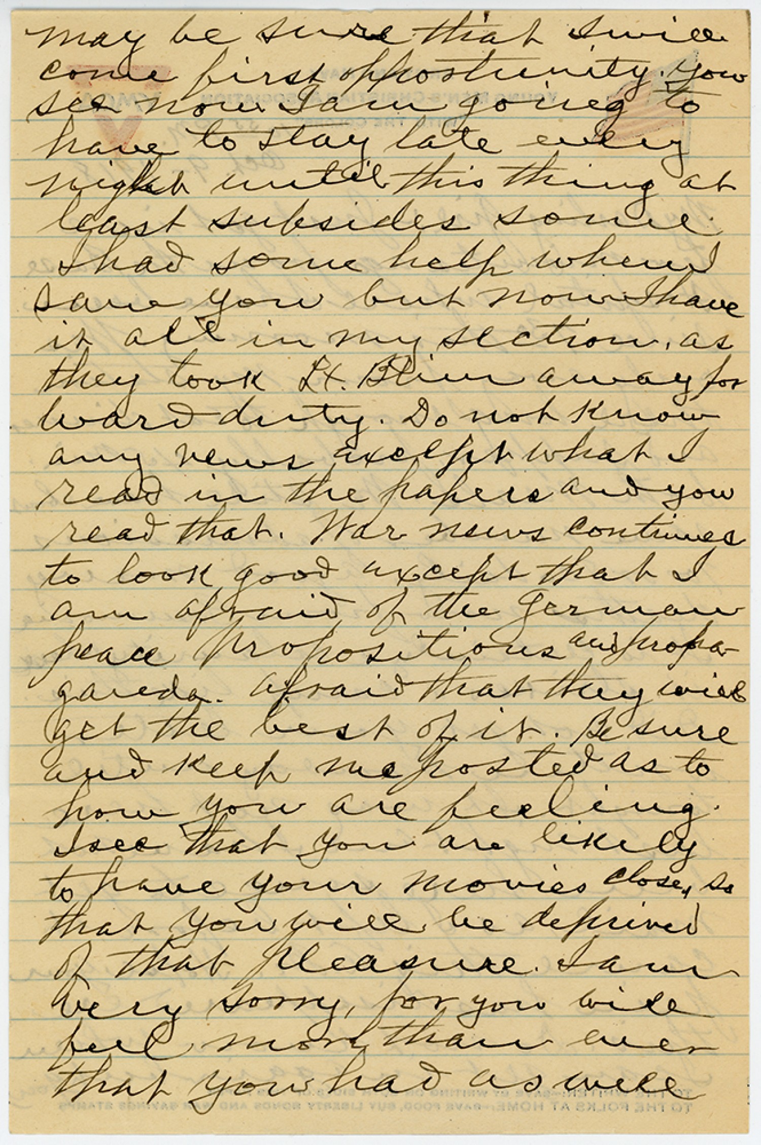 may be sure that Iwill Come first opportunity. You see now Iam going to have tostay late every night until this thing at least subsides some Ihad some help when I saw you but now Ihave it all in my section, as they took Lt. [MS illegible: 1 word] away for ward duty. Do not Know any news Except what I read in the papers and you read that. War news Continued to look good Except that I am afraid of the german peace propositions and propaganda. Afraid that they will get the best of it. Be sure and Keep me posted as to how you are feeling. Isee that you are likely to have your Movies Closed so that you will be deprived of that pleasure. Iam very sorry, for you will feel more than ever that you had as well