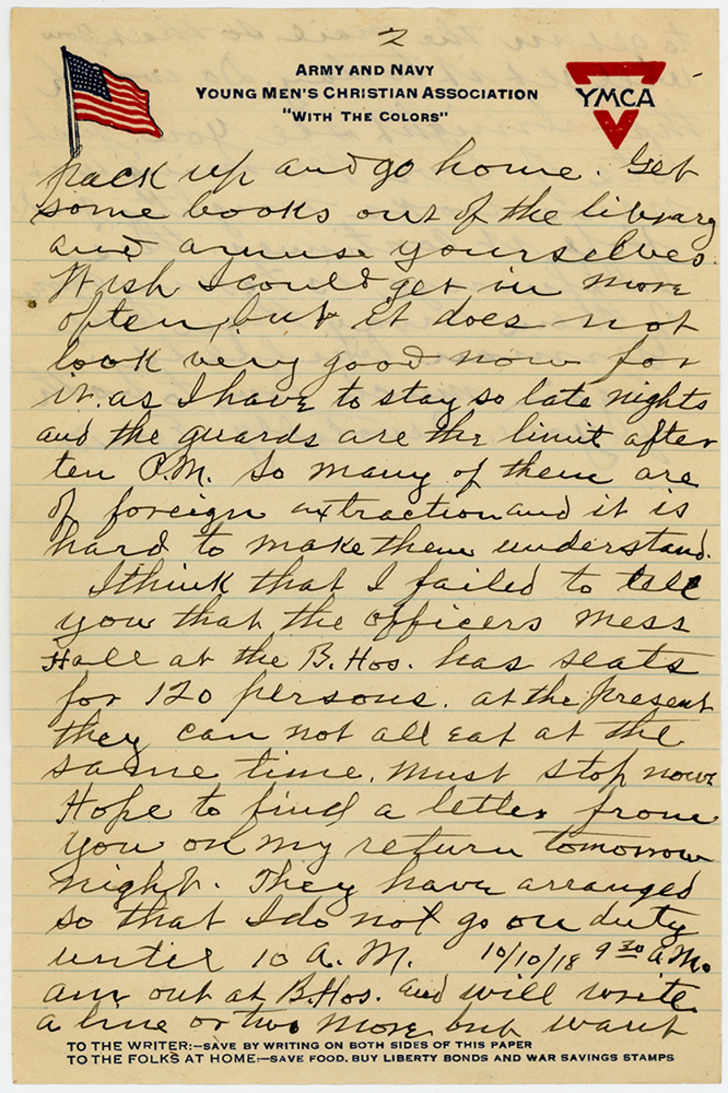 [Page 2] pack up and go home. Get some books out of the library and amuse yourselves. Wish Icould get in more often but it does not look very good now for it, as I have to stay so late nights and the guards are the limit after ten P.M. So many of them are of foreign extraction and it is hard to Make them understand. Ithink that I failed to tell you that the Officers Mess Hall at the B. Hos. has seats for 120 persons. at the present they Can not all Eat at the same time. Must stop now Hope to find a letter from you on my return tomorrow night. They have arranged so that I do not go on duty until 10 A.M. 10/10/18 9 30 A.M. am out at B.Hos. and will write a line or two More but want