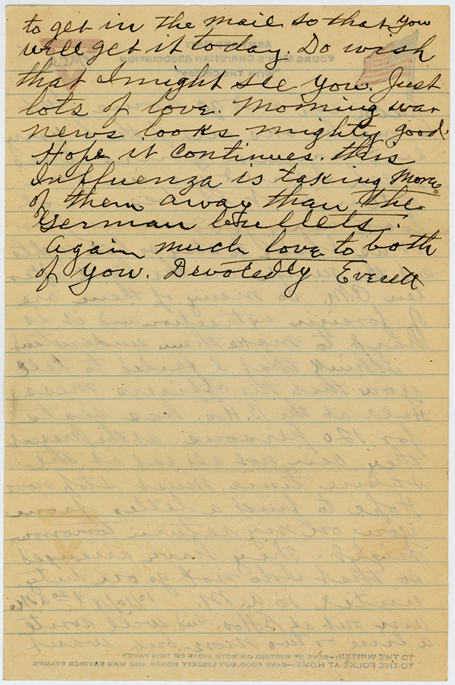 to get in the Mail so that you will get it today. Do wish that Imight see you. Just lots of love. Morning war news looks mighty good. Hope it Continues, this Influenza is taking More of them away than the German bullets. Again much love to both of you. Devotedly Everett