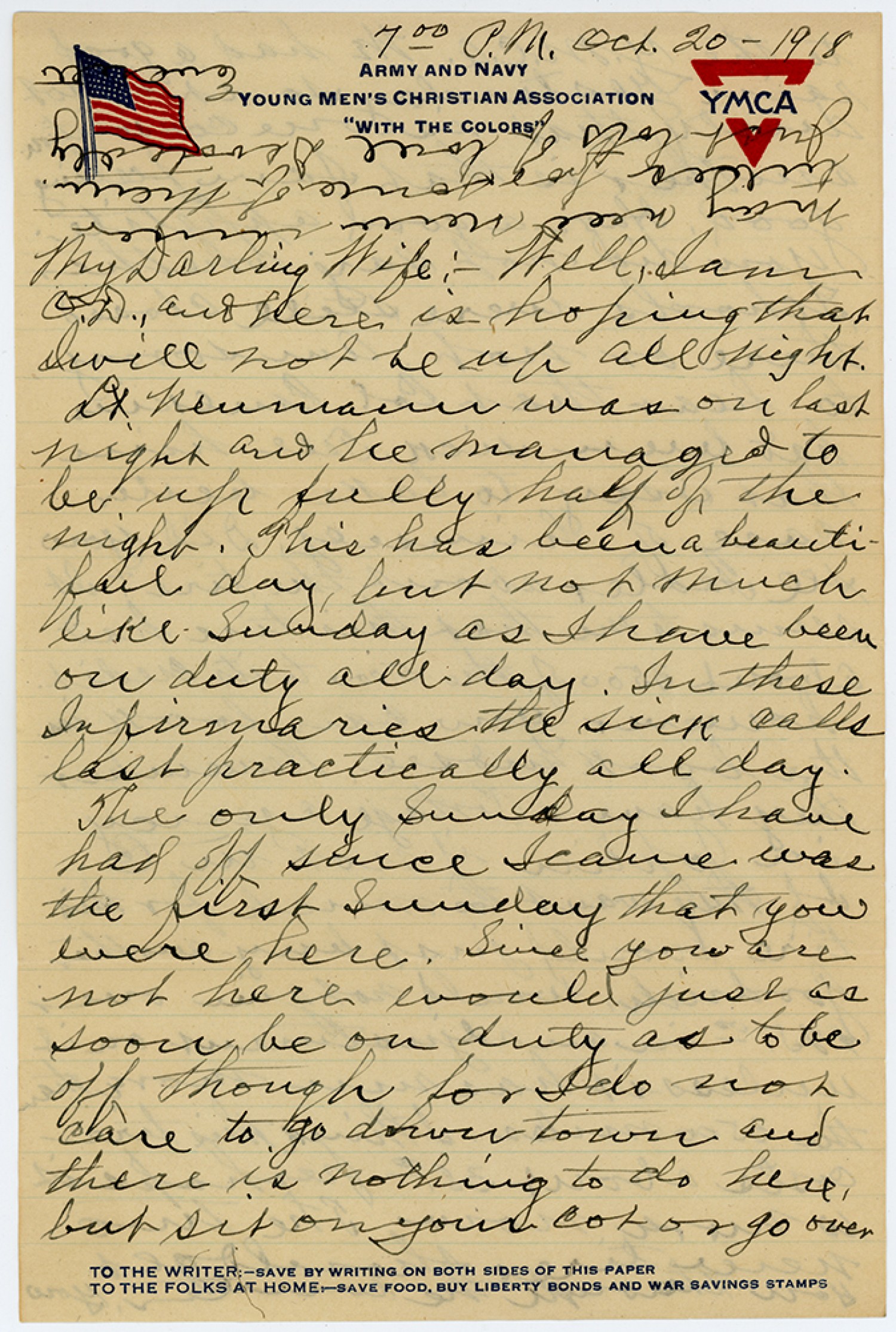 [Y.M.C.A. letterhead] 7 00 P.M. [October] 20 – 1918 MyDarling Wife : - Well, I am O.D., and here is hoping that Iwill not be up all night. Lt Neumann was on last night and he Managed to be up fully half of the night. This has been a beautiful day but not Much like Sunday as Ihave been on duty all day. In these Infirmaries the sick Calls last practically all day. The only Sunday Ihave had off since Icame was the first Sunday that you were here. Since you are not here would just as soon be on duty as to be off though for Ido not care to go down town and there is Nothing to do here, but sit on your Cot or go over [written upside down in top margin] May need New inner tubes for some of them. Just lots of love Devotedly Everett