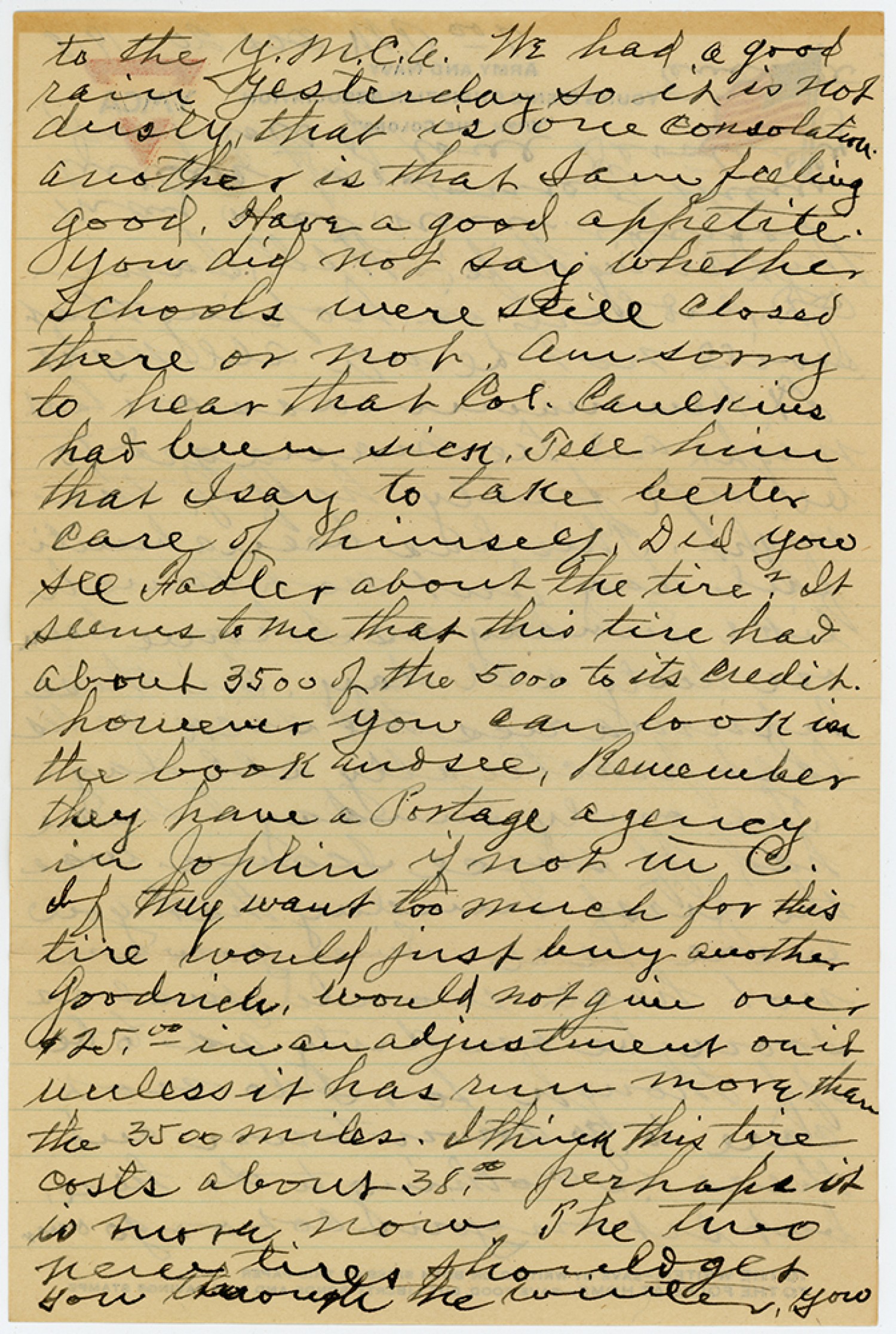 to the Y.M.C.A. We had a good rain yesterday so it is not dusty that is one Consolation another is that Iam feeling good. Have a good appetite. You did not say whether schools were still Closed there or not. Am sorry to hear that Col. Caulkins had been sick. Tell him that Isay to take better Care of himself. Did you see Fadler about the tire? It seems to me that this tire had about 3500 of the 5000 to its Credit. however you Can look in the book and see, Remember they have a Portage agency in Joplin if not in C. If they want too much for this tire would just buy another goodrich, would not give over $25.00 in an adjustment on it unless it has run more than the 3500 miles. Ithink this tire Costs about 38.00 perhaps it is more now. The two newer tires should get you through the winter, you