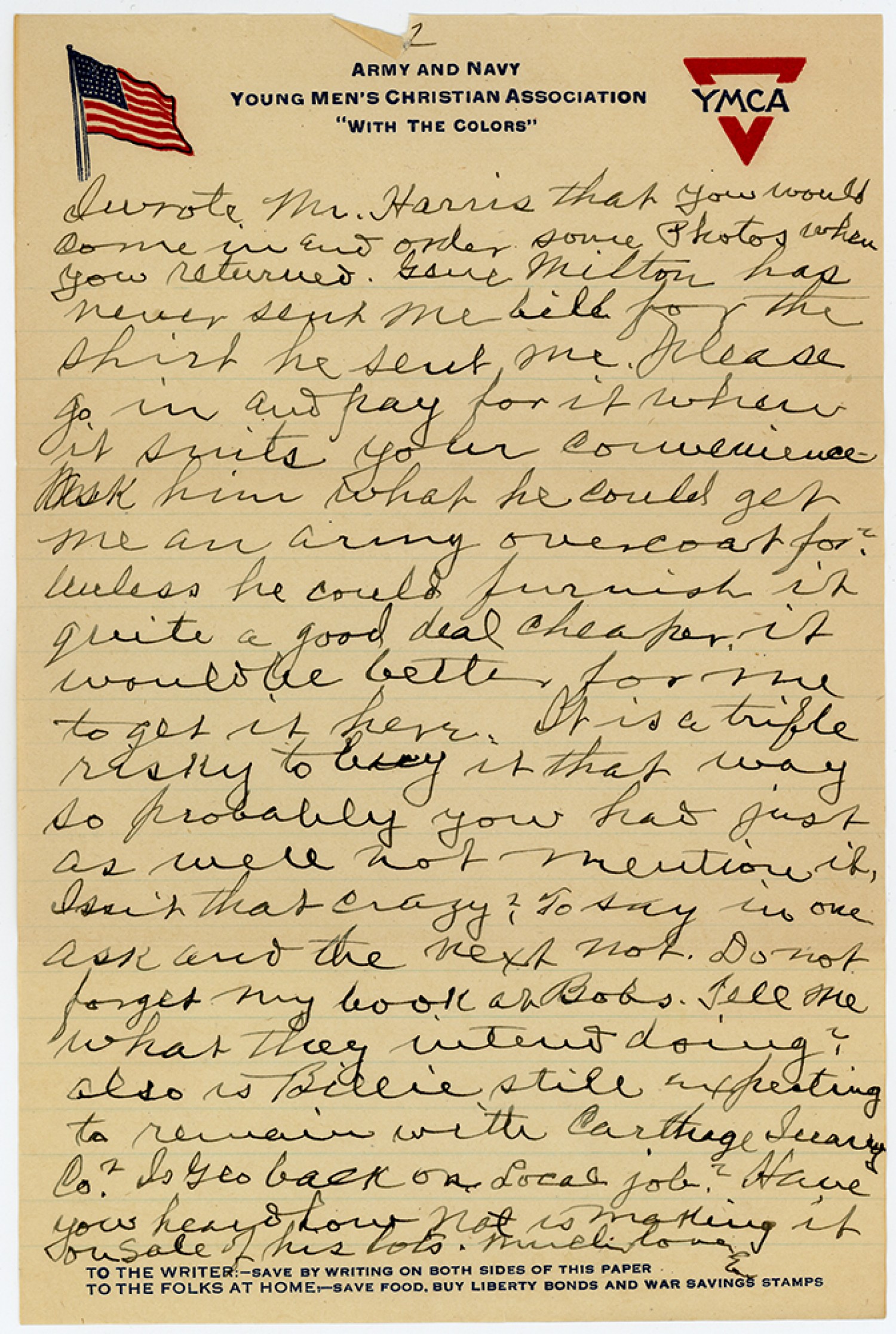 [Page 2] I wrote Mr. Harris that you would Come in and order some Photos when you returned. Gene Milton has never sent Me bill for the shirt he sent me. Please go in andpay for it when it suits your Convenience ask him what he Could get Me an army overcoat for? Unless he could furnish it quite a good deal cheaper it would be better for me to get it here. It is a trifle risky to buy it that way so probably you had just as well not mention it, Isn’t that Crazy? To say in one ask and the next not. Do not forget my book at Bobs. Tell me what they intend doing? also is Billie still Expecting to remain with Carthage Quary co? Is Geo back on Local job? Have you heardhow Nat is making it on sale of his lots. Much love E.