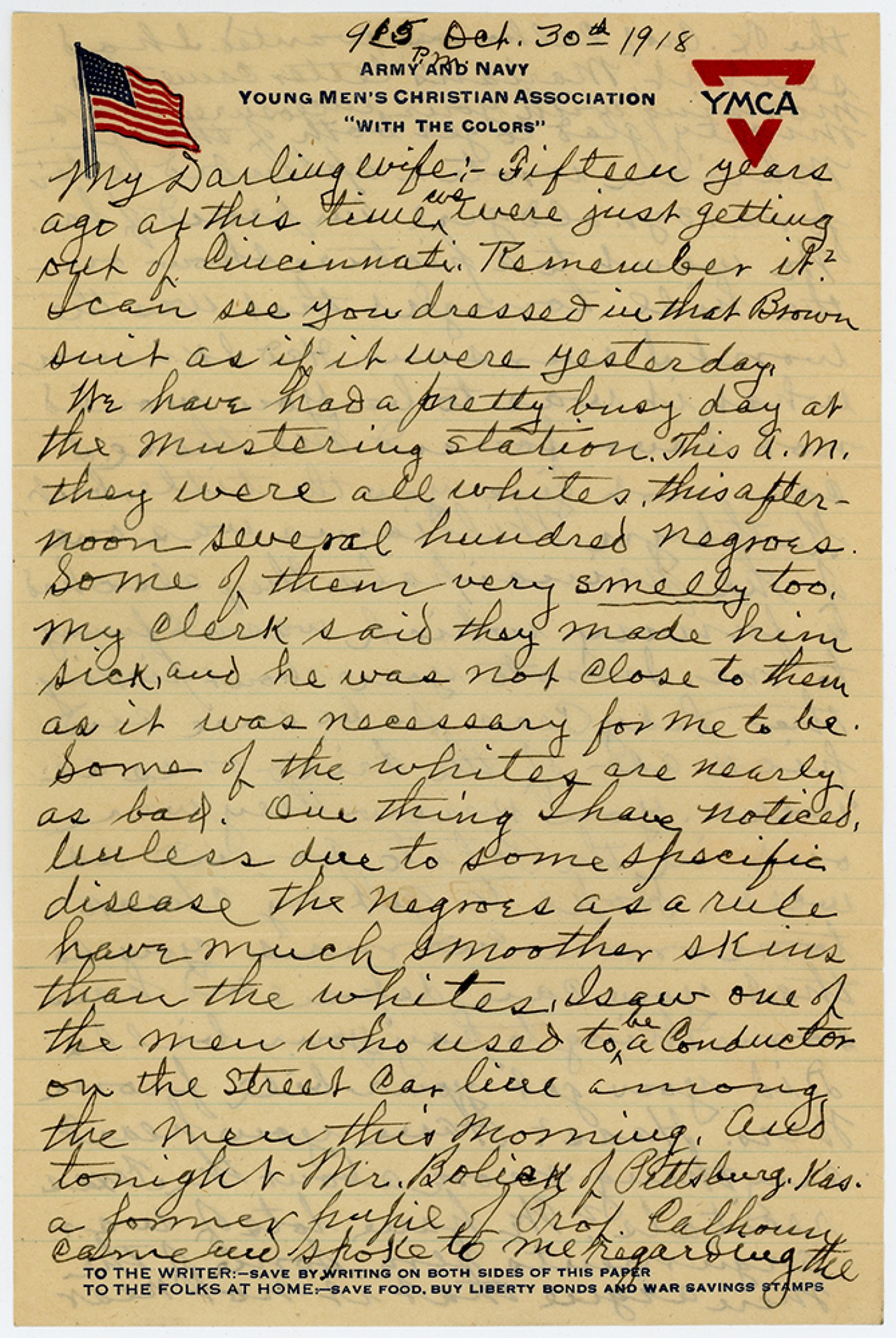 [Y.M.C.A. letterhead] 9 15 [October] 30th 1918 MyDarling Wife : - Fifteen years ago at this time we were just getting out of Cincinnati. Remember it? Ican see you dressed in that Brown suit as if it were yesterday. We have had a pretty busy day at the Mustering Station. This A.M. they were all whites, this afternoon several hundred Negroes. Some of them very Smelly too. My Clerk said they Made him sick, and he was Not Close to them as it was Necessary for Me to be. Some of the Whites are nearly as bad. One thing Ihave noticed, Unless due to some specific disease the Negroes as a rule have Much smoother skins than the whites. Isaw one of the Men who used to be a Conductor on the Street Car live among the Men this Morning. And tonight Mr. Bolick of Pittsburg. [Kansas] a former pupil of Prof. Calhoun Came and spoke to me regarding the