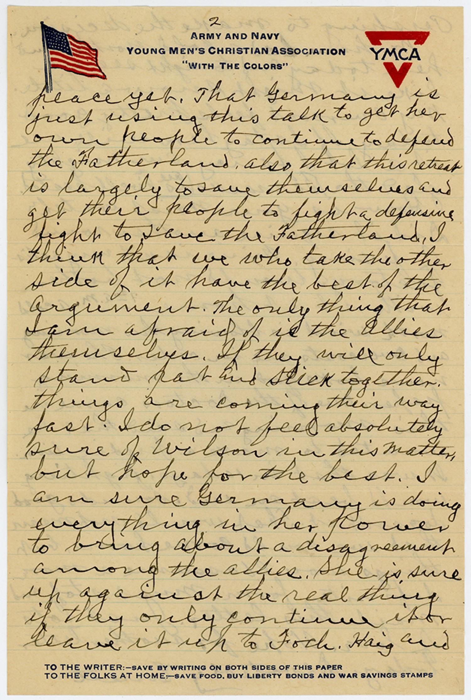 [Page 2] peace yet. That Germany is just using this talk to get her own people to continue to defend the Fatherland, also that this retreat is largely tosave themselves and get their people to fight a defensive fight tosave the Fatherland. I think that we who take the other side of it have the best of the Argument. The only thing that Iam afraid of is the Allies themselves. If they will only stand pat and stick together, things are Coming their way fast. Ido not feel absolutely sure of Wilson in this Matter, but hope for the best. I am sure Germany is doing everything in her power to bring about a disagreement among the Allies. She is sure up against the real thing if they only Continue it or leave it up to Foch. Haig and