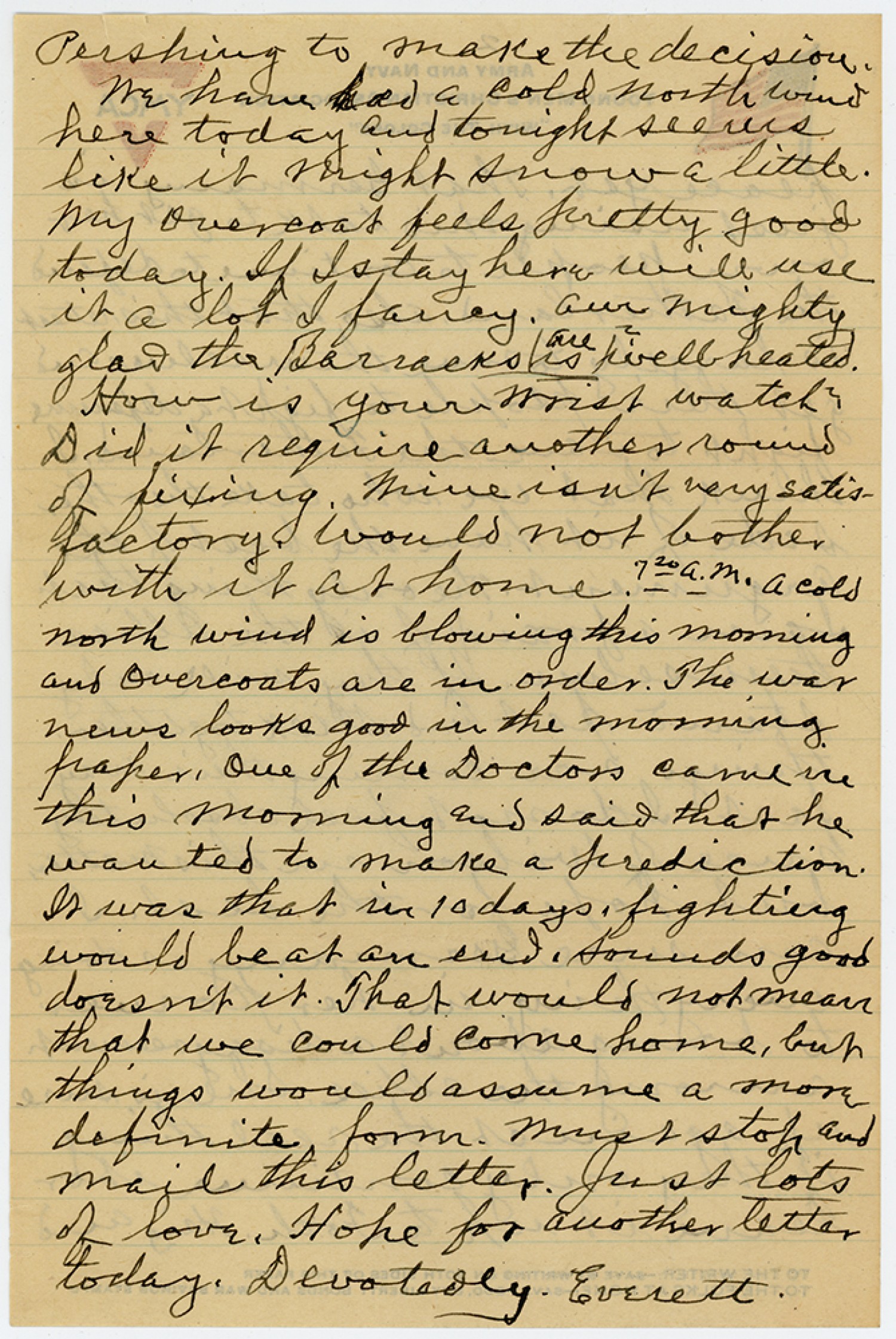 Pershing to Make the decision. We have had a Cold North wind here today and tonight seems like it Might snow a little. My Overcoat feels pretty good today. If Istay here will use it a lot I fancy. am Mighty glad the Barracks are well heated. How is your Wrist watch? Did it require another round of fixing. Mine isn’t very satisfactory. Would not bother with it at home 7 20 A.M. A Cold North Wind is blowing this morning and Overcoats are in order. The war news looks good in the morning paper. One of the Doctors Came in this morning and said that he wanted to make a prediction. It was that in 10 days, fighting would be at an end. Sounds good doesn’t it. That would not mean that we Could Come home, but things would assume a more definite form. Must stop and Mail this letter. Just lots of love. Hope for another letter today. Devotedly. Everett.