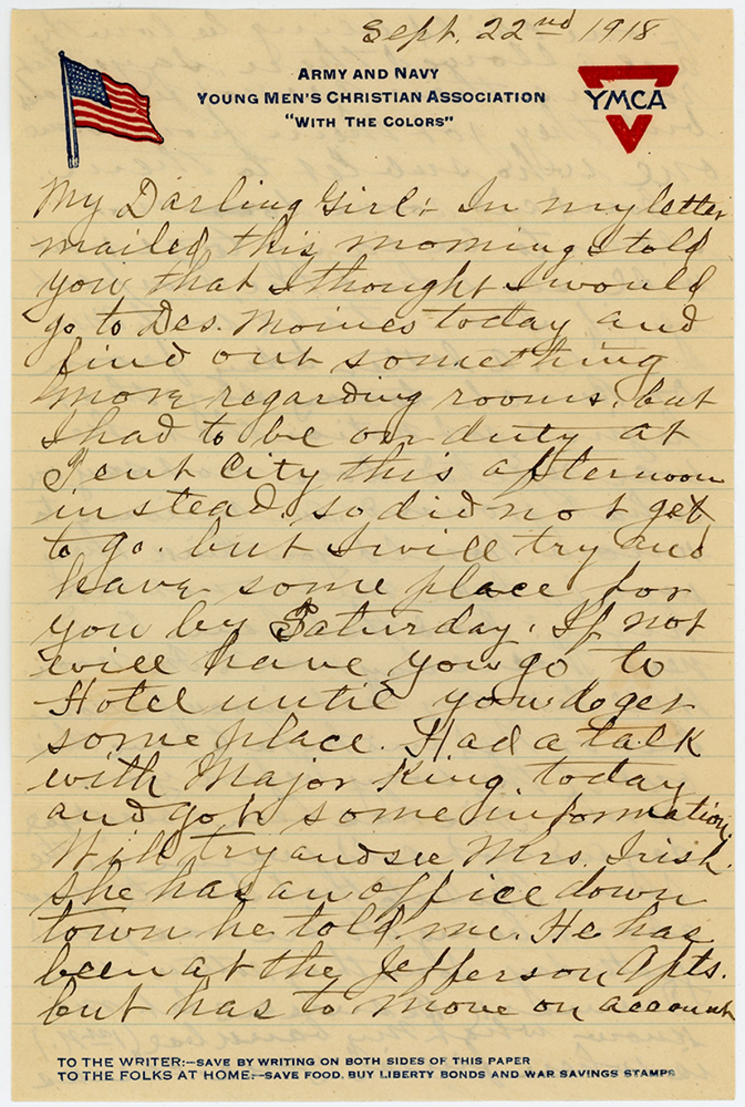 [Y.M.C.A. letterhead] [September] 22nd 1918 My Darling Girl : - In my letter mailed this morning Itold you that Ithought Iwould go to Des Moines today and find out something more regarding rooms, but I had to be on duty at Tent City this afternoon instead so did not get to go, but I will try and have some place for you by Saturday. If not will have you go to Hotel until you do get some place. Had a talk with Major King today and got some information. Will try and see Mrs Irish she has an office down town he told me. He has been at the Jefferson Apts. but has to move on account