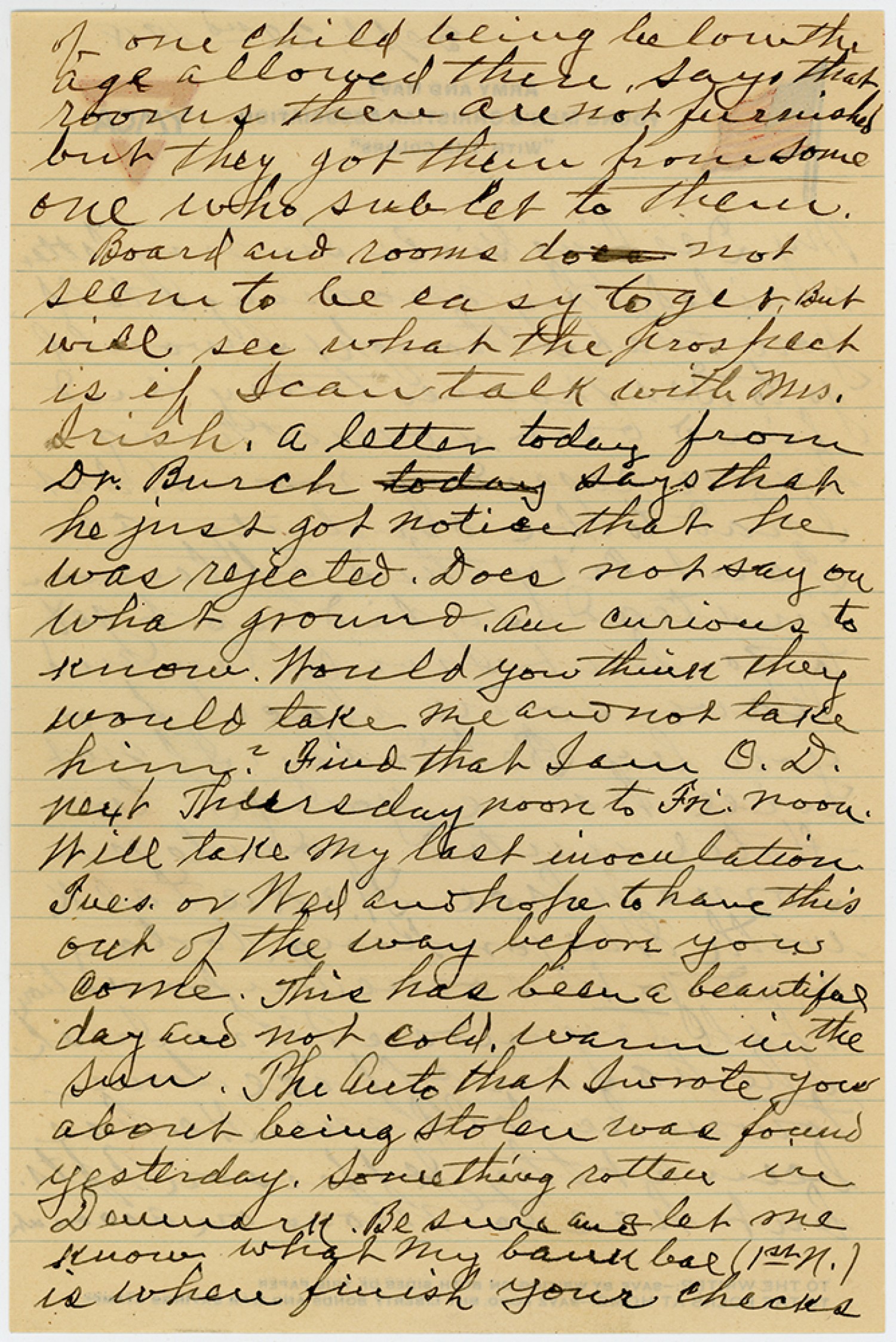 of one child being below the age allowed there, says that rooms there are not furnished but they got them from some one who sub let to them. Board and rooms do not seem to be easy to get, But will see what the prospect is if Ican talk with Mrs. Irish. A letter today from Dr. Burch says that he just got notice that he was rejected. Does not say on what ground. Am curious to know. Would you think they would take me and not take him? Find that Iam O.D. next Thursday noon to [Friday] noon Will take my last inoculation [Tuesday] or [Wednesday] and hope to have this out of the way before you Come. This has been a beautiful day and not Cold. Warm in the sun. The Auto that I wrote you about being stolen was found yesterday. Something rotten in Denmark. Be sure and let me know what My bank bal (1st N.) is when finish your Checks