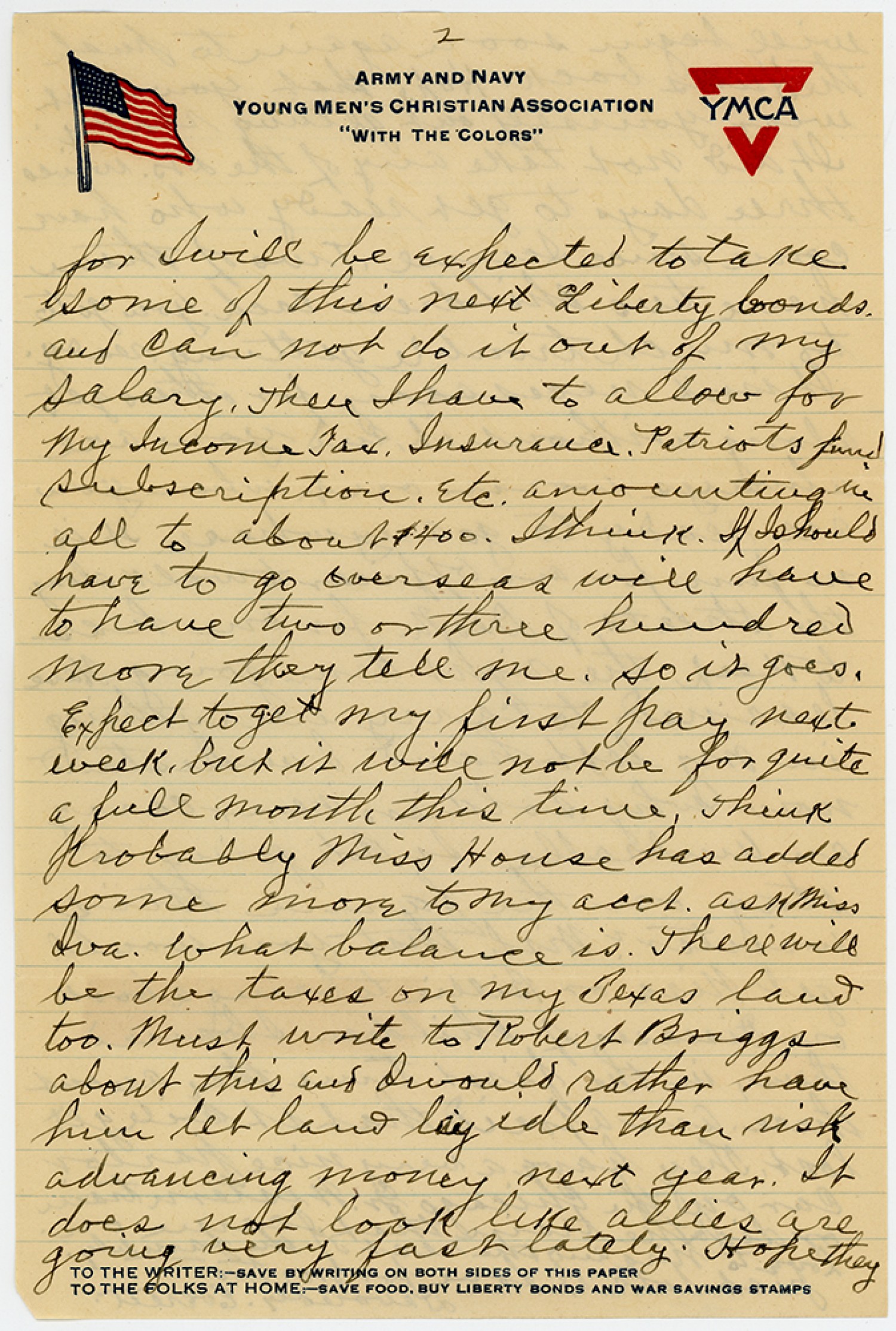 [Page 2] for I will be Expected to take some of this next Liberty bonds. and Can not do it out of my salary. There I have to allow for My Income Tax, Insurance Patriots fund subscription, Etc. amounting in all to about $400. I think. If I should have to go overseas will have to have two or three hundred more they tell me. So it goes. Expect to get my first pay next week, but it will not be for quite a full month this time. Think probably Miss House has added some more to my acct. ask Miss Iva what balance is. There will be the taxes on my Texas land too. Must write to Robert Briggs about this and Iwould rather have him let land lay idle than risk advancing money next year. It does not look like allies are going very fast lately. Hope they