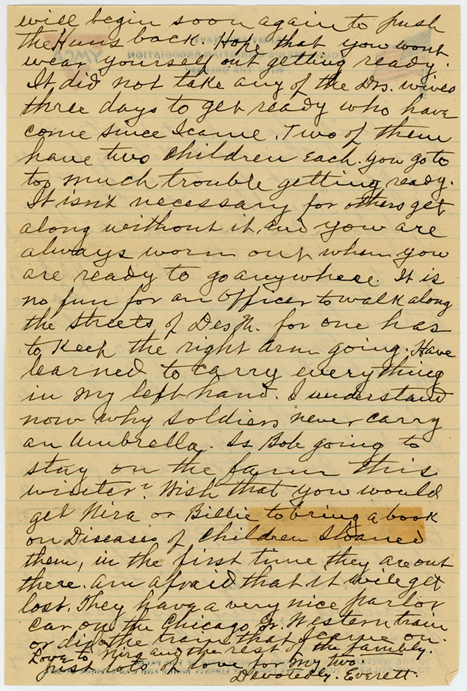 will begin soon again to push the Huns back. Hope that you wont wear yourself out getting ready. It did not take any of the Drs. wives three days to get ready who have come since Icame. Two of them have two children each. you go to too much trouble getting ready. It isn’t necessary for others get along without it, and you are always worn out when you are ready to go anywhere. It is no fun for an officer to walk along the streets of [Des Moines] for one has to keep the right Arm going. Have learned to carry every thing in my left hand. I understand now why soldiers never carry an Umbrella. Is Bob going to stay on the farm this winter? Wish that you would get Nira or Billie to bring a book on Diseases of Children I loaned them, in the first time they are out there. Am afraid that it will get lost. They have a very nice parlor Car on the Chicago Gr. Western train or did on the train that I came on. Love to Nira and the rest of the family. Just lots of love for my two. Devotedly. Everett