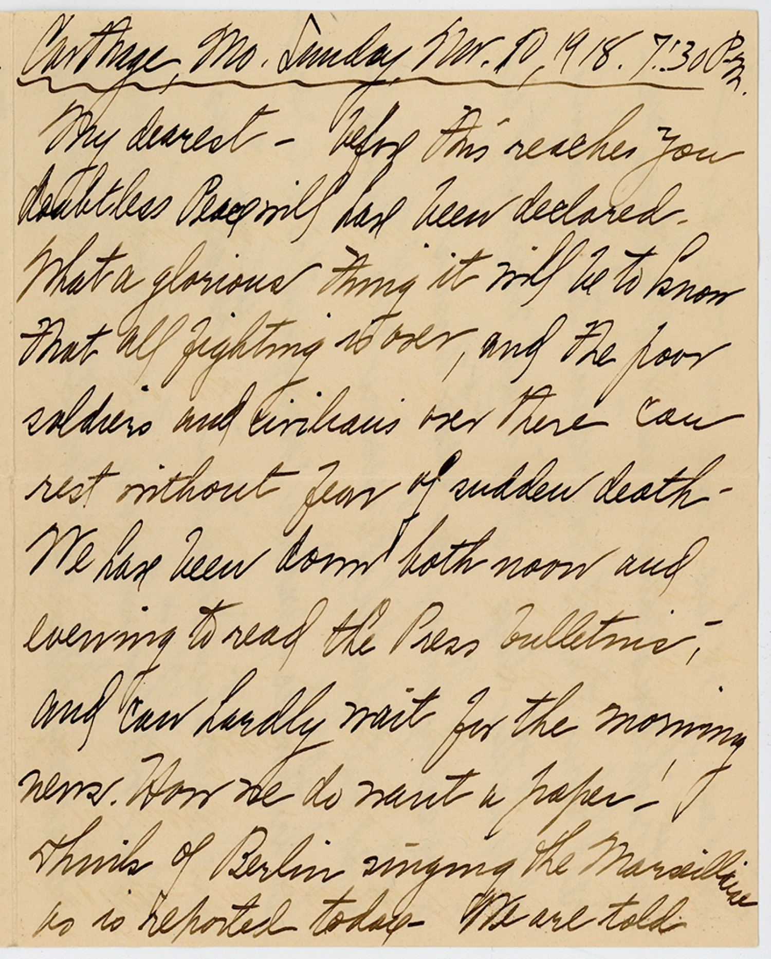 Carthage, MO. Sunday [November] 10, 1918 7:30 P.M. My dearest – before this reaches You doubtless Peace will have been declared. What a glorious thing it will be to know that all fighting is over, and the poor soldiers and civilians over there Can rest without fear of sudden death. We have been down both noon and evening to read the Press bulletins, - and Can hardly wait for the morning news. How we do want a paper! thinks of Berlin singing the Marseillaise as is reported today – We are told