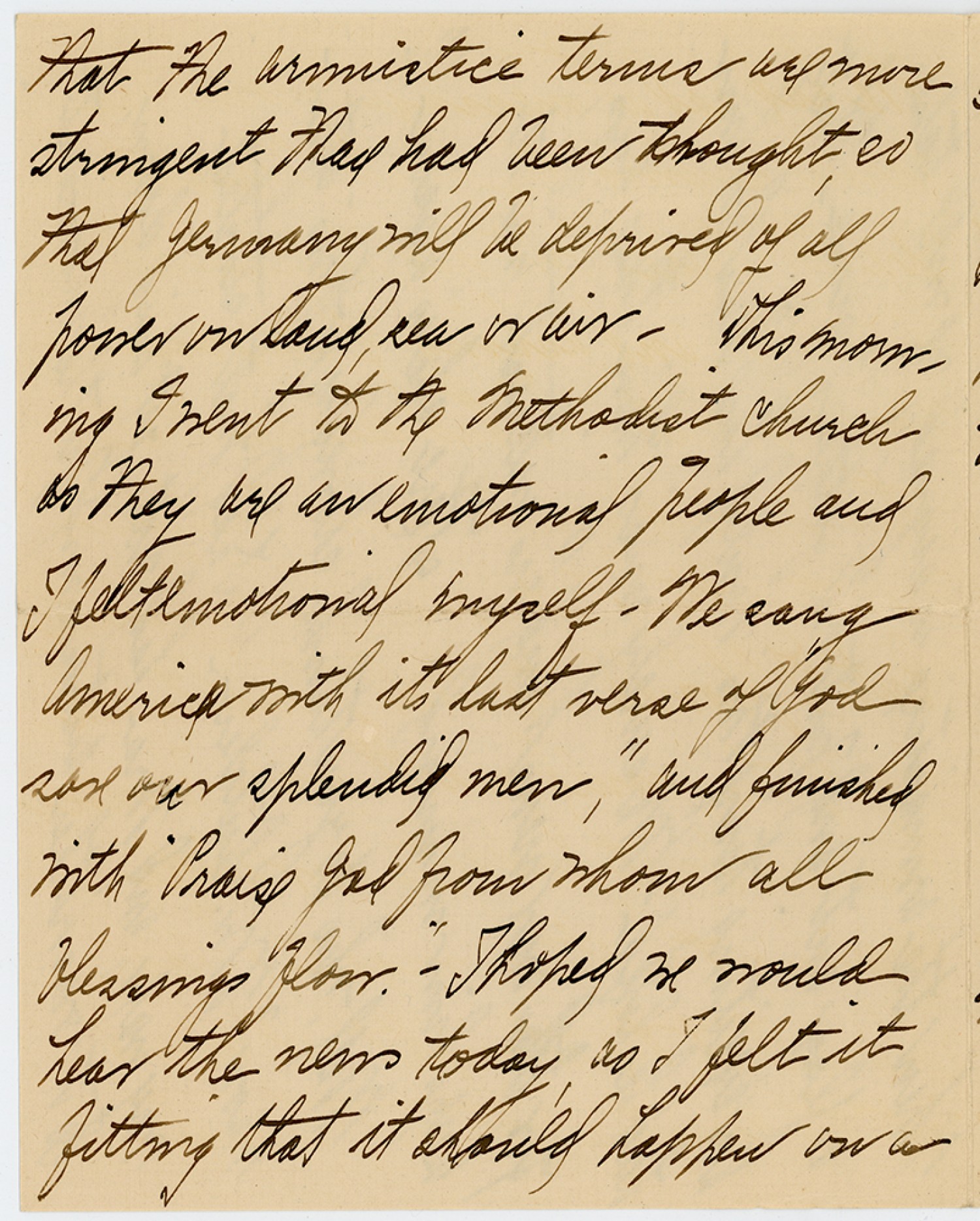 that the Armistice terms are more stringent than had been thought, so that Germany will be deprived of all power on land, sea or air. This morning I went to the Methodist Church as they are an emotional people and I felt emotional myself – We sang America with its last verse of “God save our splendid men, “and finished with “Praise God from Whom all blessings flow.” – I hoped we would hear the news today, as I felt it fitting that it should happen on a