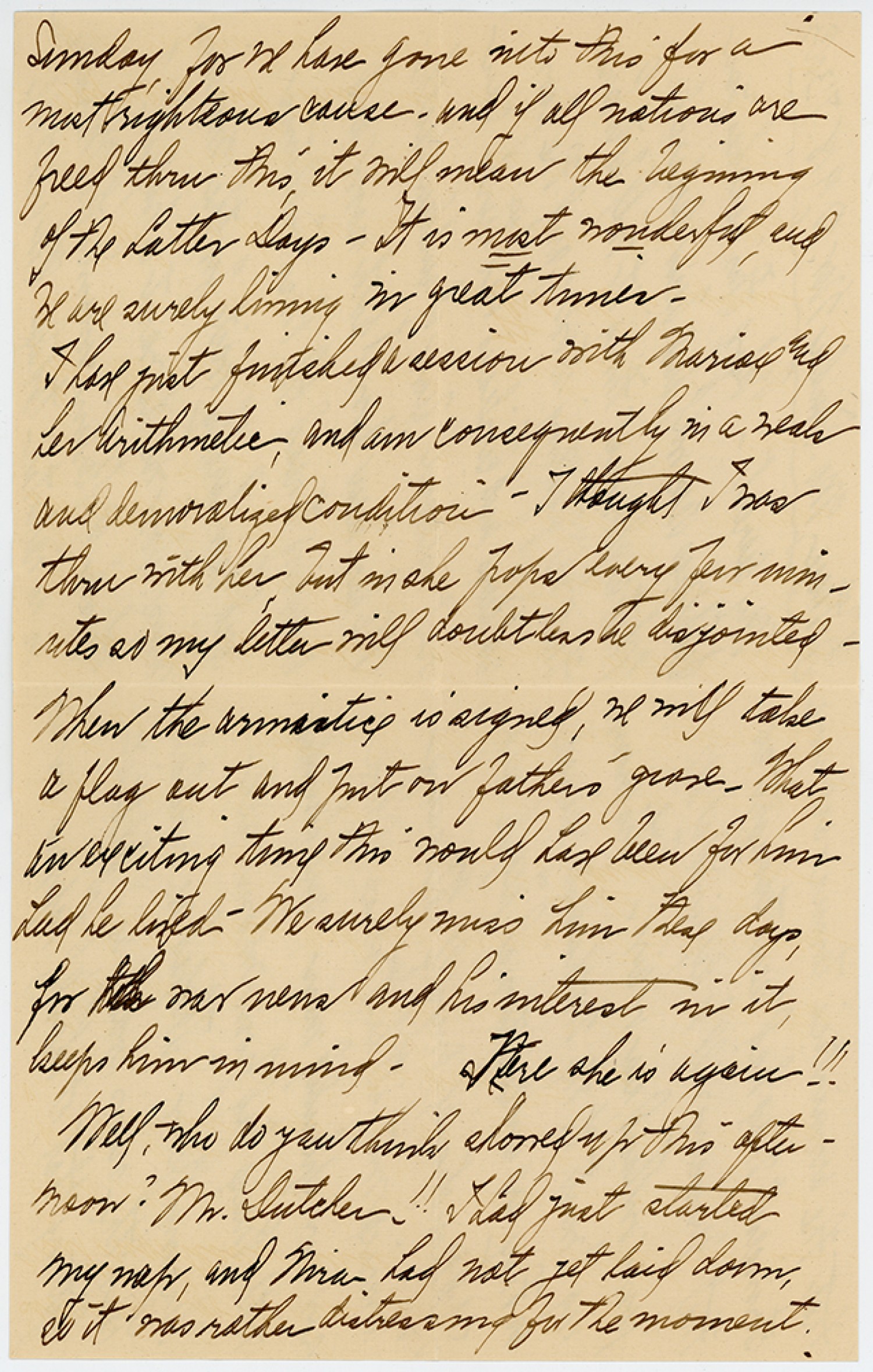 Sunday for we have gone into this for a most righteous cause, and if all nations are freed thru this it will mean the beginning of the Latter Days – It is most wonderful and we are surely living in great times. I have just finished a session with Marian and her Arithmetic, and am Consequently in a weak and demoralized condition – I thought I was thru with her but in she pops every few minutes so my letter will doubtless be disjointed. When the Armistice is signed, we will take a flag out and put our fathers grave. What an exciting time this would have been for him had he lived. We surely miss him [MS illegible: 1 word] days, for the war news and his interest in it keeps him in mind. There she is again!!! Well who do you think showed up this afternoon? Mr. Dutcher!! I had just started My nap, and Mra had not yet laid dorm so it was rather distressing for the moment.