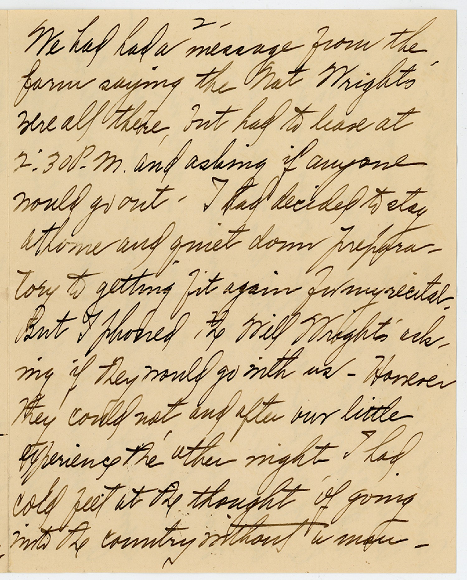 [Page 2] We had had a message from the farm saying the Nat Wrights are all there, but had to leave at 2:30 P.M. and asking if anyone would go out. I had decided to stay at home and quiet down preparatory to getting fit again for my recital. But I phoned the Will Wrights asking if they would go with us. However they could not and after our little experience the other night I had Cold feet at the thought of going into the Country without a man.