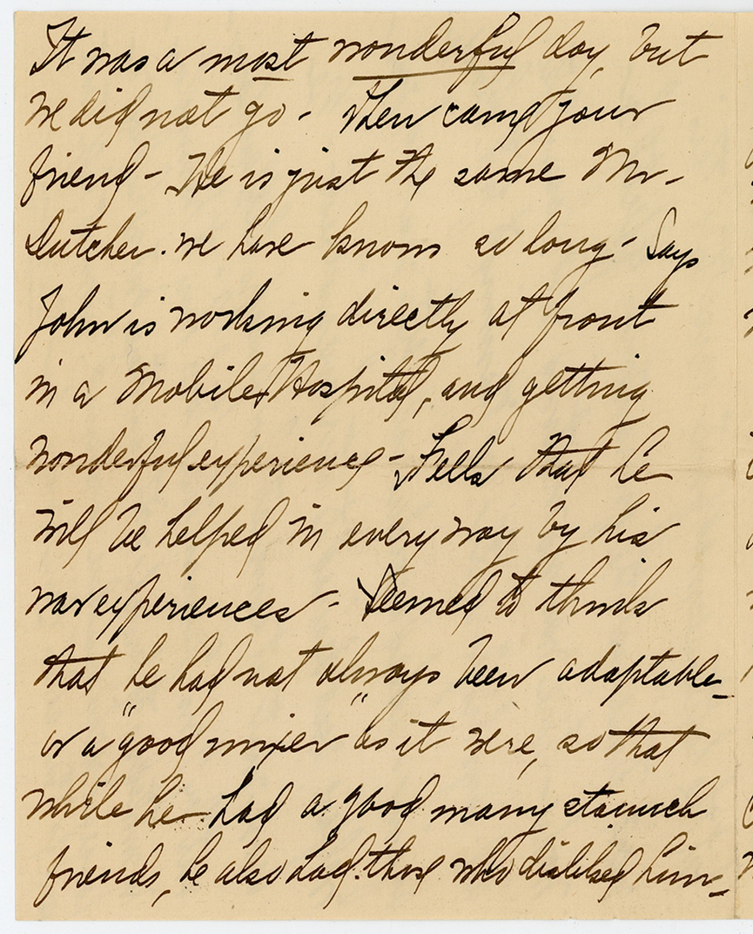 It was a most wonderful day, but We did not go. Then came your friend. He is just the same Mr. Dutcher. We have known so long. Says John is working directly at front in a Mobile Hospital, and getting Wonderful experience. Feels that he will be helped in every way by his war experience. Seemed to think that he had not always been adaptable or a “good mixer” as it were, so that While he had a good many staunch friends, he also had those who disliked him.