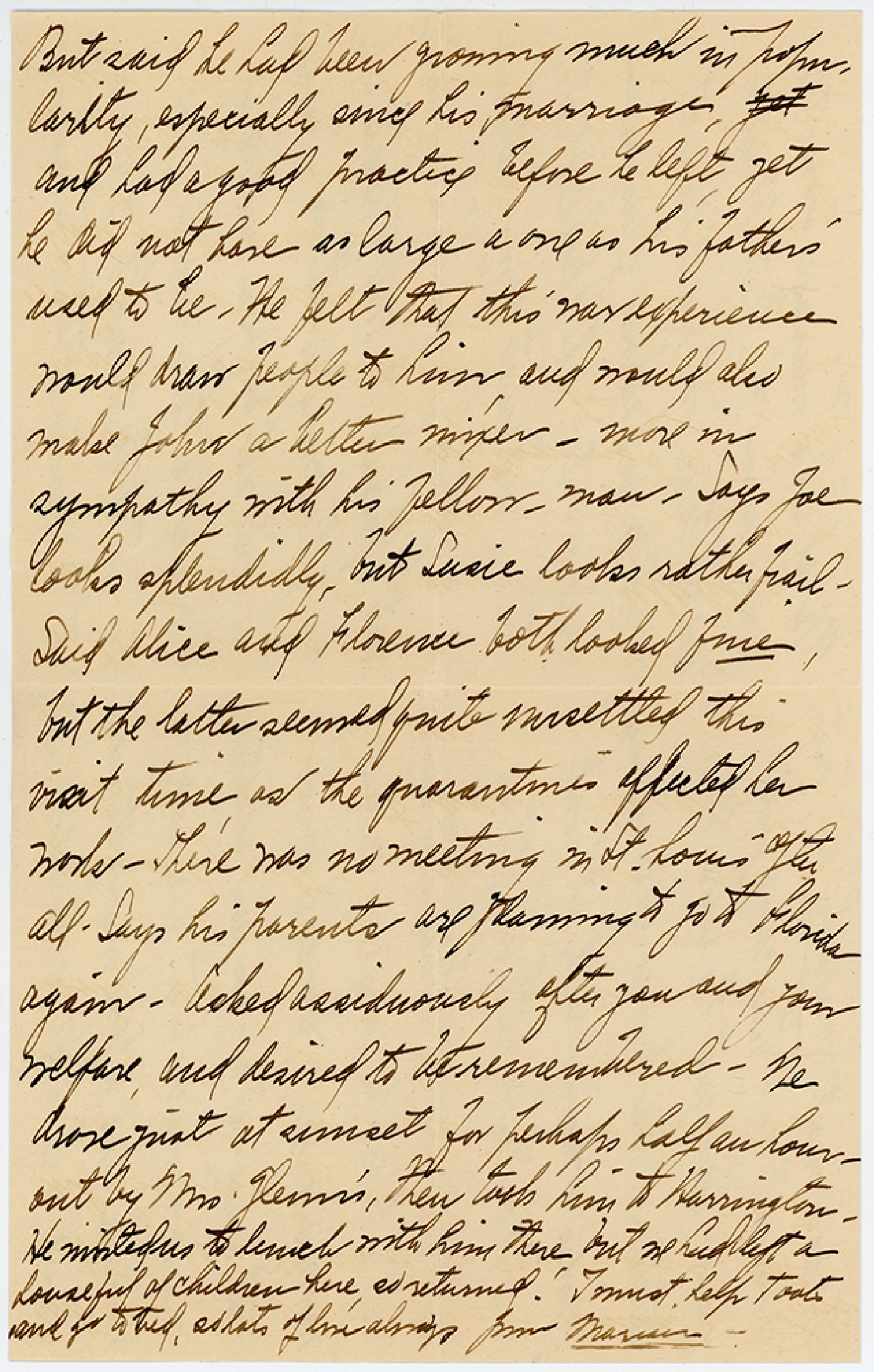 But said he had been growing much in popularity, especially since his marriage, and had a good practice before he left yet he did not have as large a one as his father’s used to be. He felt that this war experience would draw people to him and would also make John a better mixer. more in sympathy with his fellow, man, Says Joe looks splendidly, but Lusie looks rather frail – Said the latter seemed quite unsettled this visit time as the quarantine affected her work. There was no meeting in St. Louis after all. Says his parents are planning to go to Florida again. Asked assiduously after you and your welfare and desired to be remembered. We arose just at sunset for perhaps half an hours, out by Mrs. Glenn’s, then took him to Harrington. He wished us to lunch with him there but we had left a houseful of Children here so returned. I must help toat and go to bed, so lots of love always from Marian