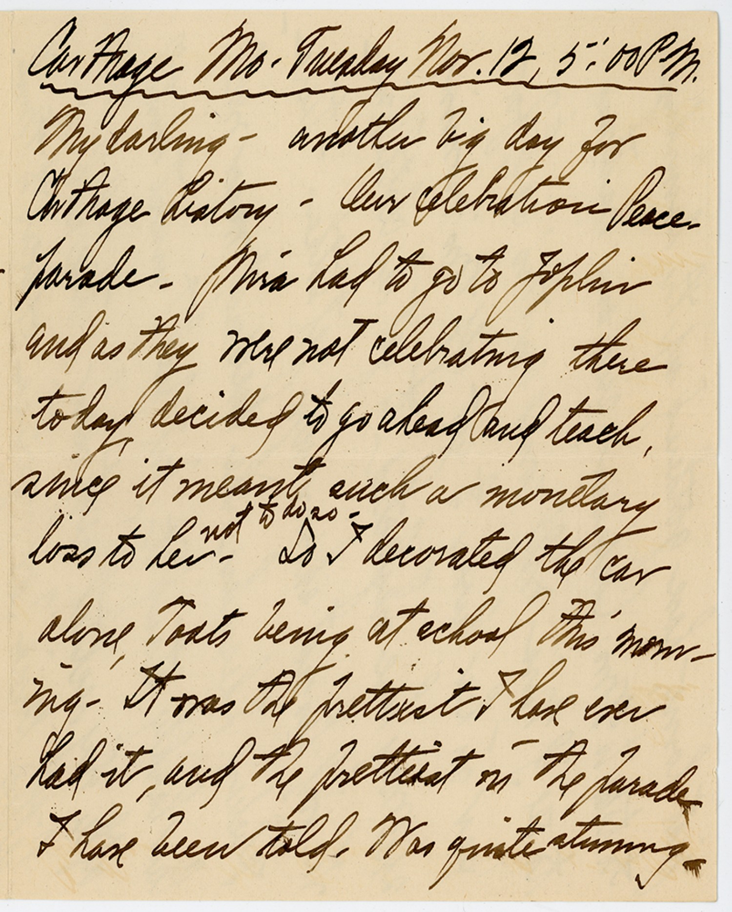 Carthage Mo. Tuesday [November] 12, 5:00 P.M. My darling – another big day for Carthage history – Our celebration Peace parade – Nira had to go to Joplin and as they were not celebrating there today decided to go ahead and teach, since it meant such a Monetary loss to her not to do so – So I decorated the car alone Toats being at school this morning – It was the prettiest I have ever had it, and the prettiest in the parade I have been told. Was quite stunning