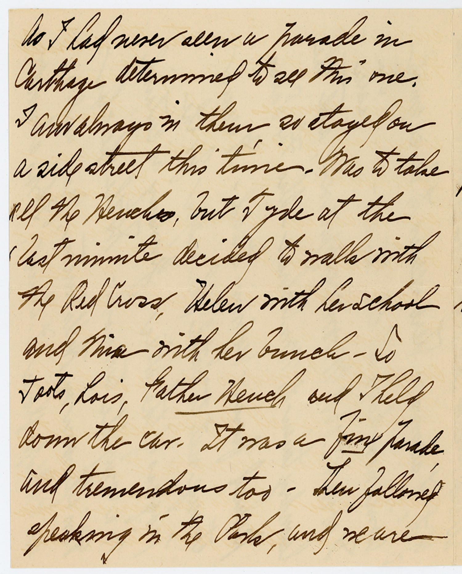 As I had never seen a parade in Carthage determined to see this one. I am always in them so stayed on a side street this time. Was to take all the Henches, but Tyde at the last minute decided to walk with the Red Cross. Helen with her school and Nira with her bunch – So toats, Lais, Father Hench and I held down the car. It was a fine parade and tremendous too. Then followed speaking in the Park, and we are