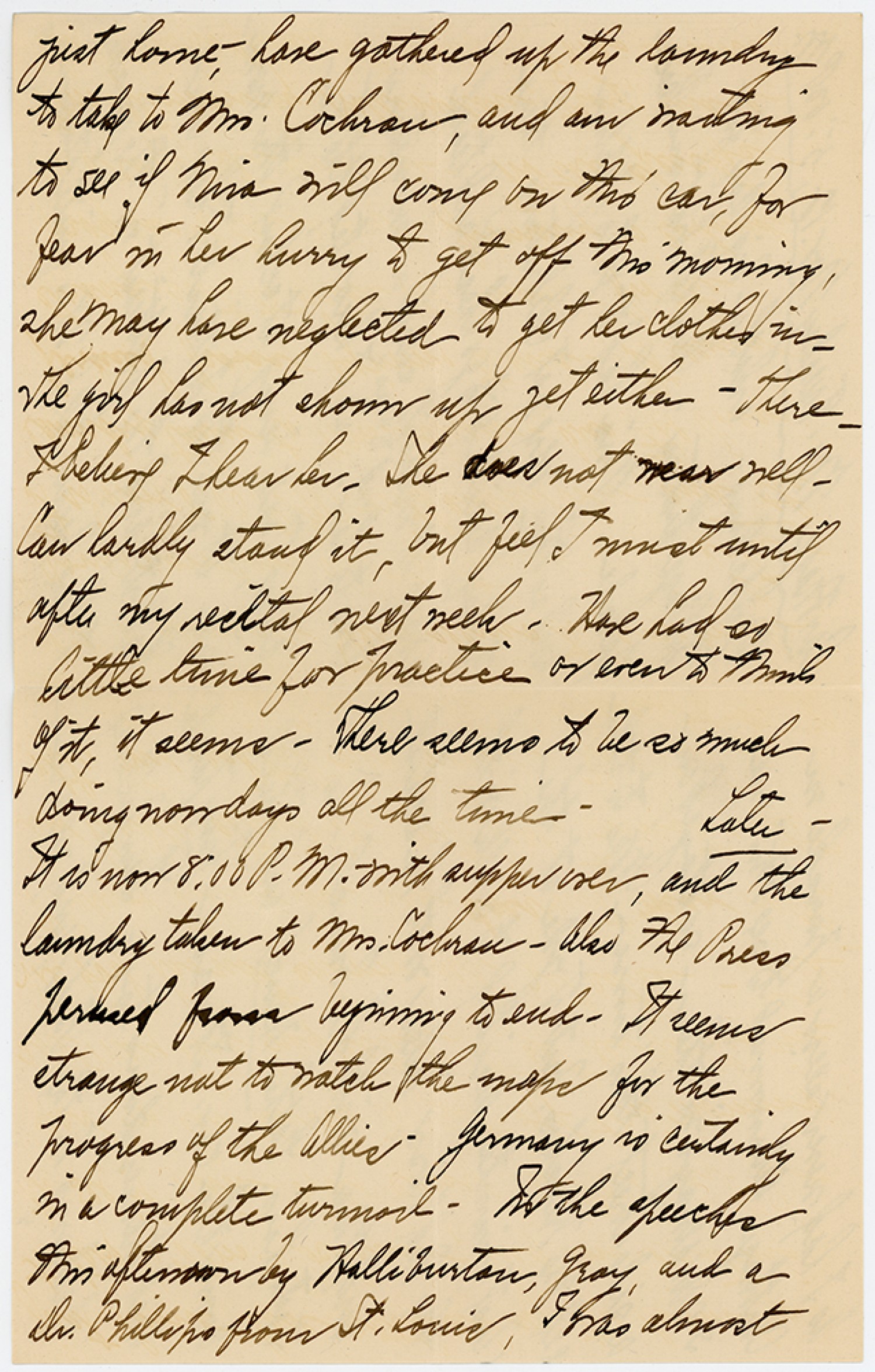 just home – have gathered up the laundry to take to Mrs. Cahron, and am waiting to see if Nira will come on this car, for fear in her hurry to get off this morning, she may have neglected to get her clothes in. The girl has not shown up yet either. There I believe I hear her. She does not hear well. Can hardly stand it, but feel I must until after my recital next week. Have had so little time for practice or even to think of it, it seems. There seems to be so much doing now days all the time. Later – It is now 8:00 P.M. with supper over, and the laundry taken to Mrs. Cochran – Also The Press perused from beginning to end. It seems strange not to watch the maps for the progress of the Allies. Germany is Certainly in a Complete turmoil. In the speeches this afternoon Halli burton gray, and a Dr. Phillips from St. Louis. I was almost