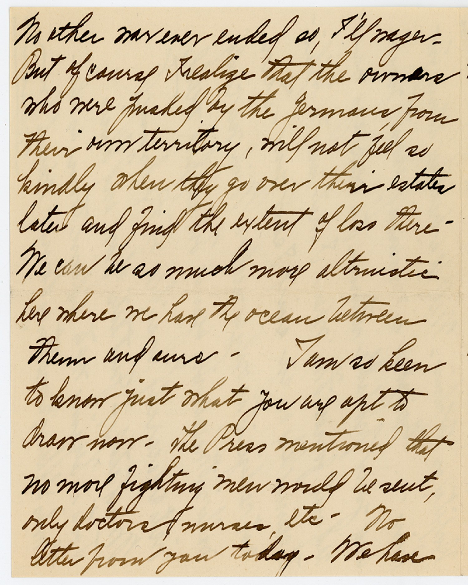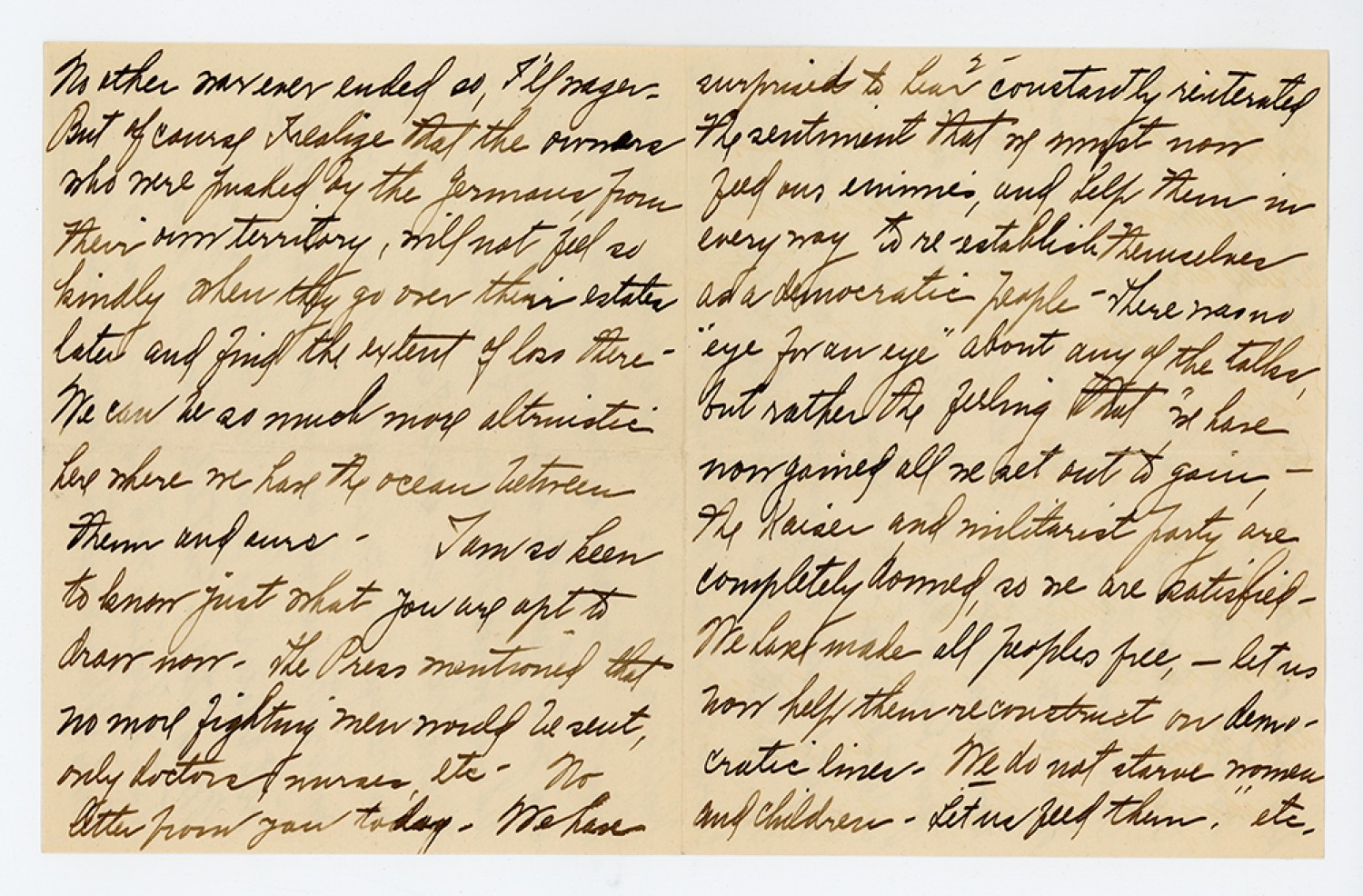 [Page 2] surprised to hear constantly reiterated the sentiment that we must now feed our enime’s and help them in every way to re-establish themselves as a democratic people. There was no “eye for an eye” about any of the talks, but rather the feeling that “we have now gained all we set out to gain – The Kaiser and militarist party are Completely doomed so we are satisfied. We have made all peoples free, - let us now help them reconstruct on democratic lines. We do not starve women and Children. Let us feed them.” etc.