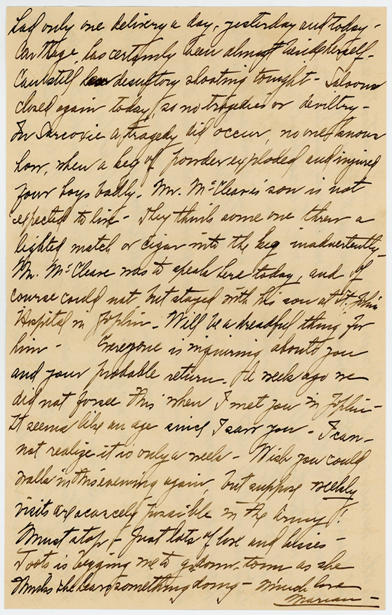 had only one delivery a day, yesterday and today – Carthage has certainly been almost beside herself. Can still hear desultory shooting tonight. Saloons closed again Today, so no tragedies or deviltry. In Sarcozie a tragedy did occur, no one knows how, when a keg of powder exploded and injured four boys badly. Mr. McCleare’s son is not expected to live. They think some one threw a lighted match or cigar into the keg inadvertently. Mr. McCleare was to speak here today, and of course could not but stayed with his son at St. John’s Hospital in Joplin. Will be a dreadful thing for him. [ms illegible: 1 word] is inquiring about you and your probable return. A week ago we did not forsee this when I met you in Joplin. It seems like an age since I saw you. I can not realize it is only a week. Wish you could walk in this evening again but suppose weekly visits are scarcely possible in the Army! Must stop. Just lots of love and kisses – Toots is begging me to do down town as she thinks the Car something domy – Much love Marian