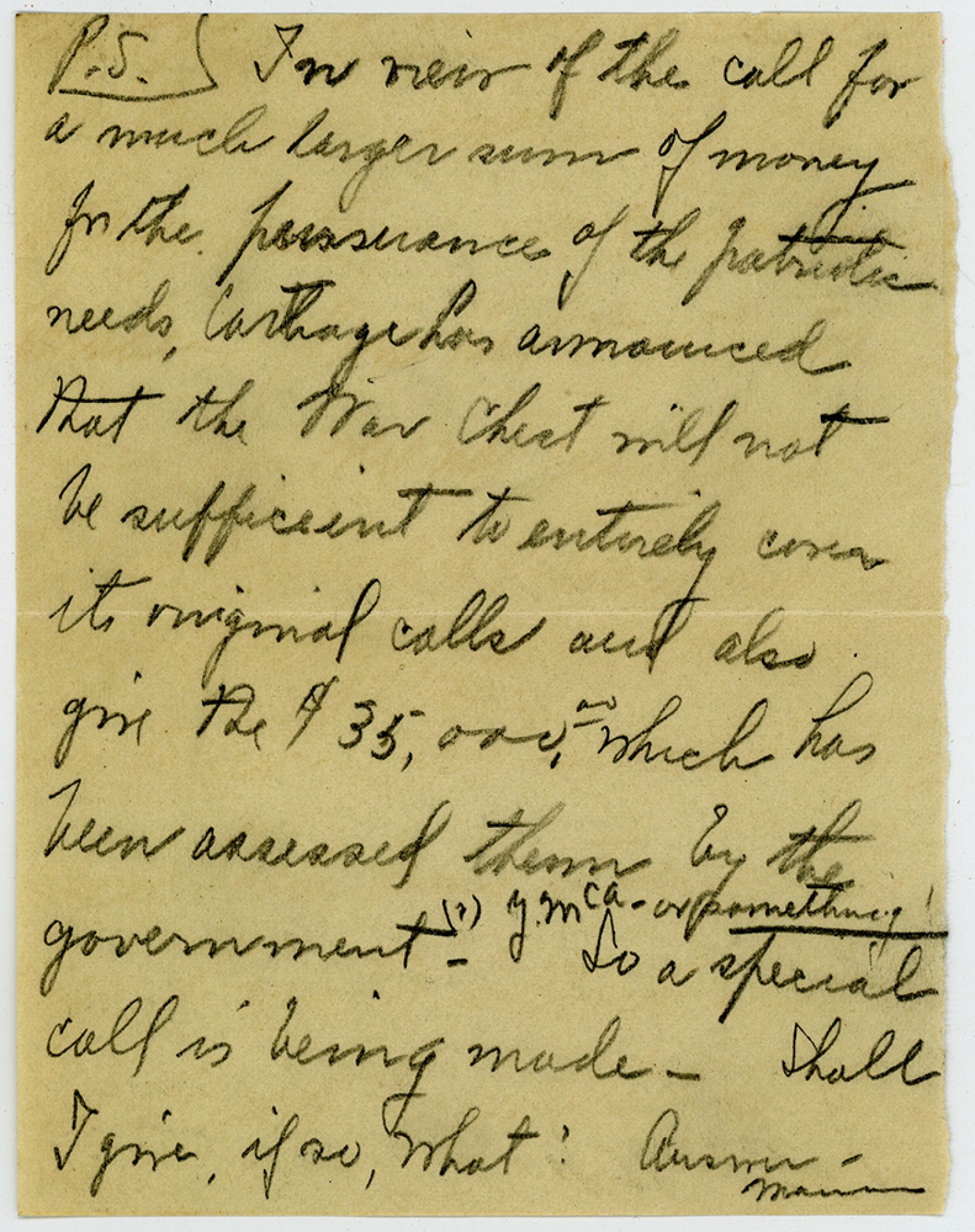 P.S. In [ms illegible: 1 word] of the call for a much larger sum of money for the preservance of the patriotic needs Carthage has announced that the War Chest will not be sufficient to entirely cover its original calls and also give the $35,000.00 which has been assessed them by the government? Y.M.C.A. or something So a special Call is being made. Shall I give, if so, What? Answer – Marian