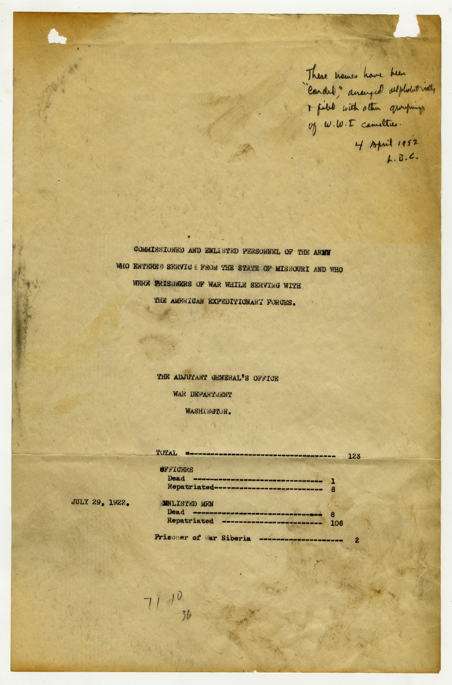 These names have been “[ms illegible],” arranged allphabetically, & filed with other groupings of W.W.I. casualties. 4 April 1952 L.B.C. COMMISSIONED AND ENLISTED PERSONNEL OF THE ARMY WHO ENTERED SERVICE FROM THE STATE OF MISSOURI AND WHO WERE PRISONERS OF WAR WHILE SERVING WITH THE AMERICAN EXPEDITIONARY FORCES. THE ADJUTANT GENERAL’S OFFICE WAR DEPARTMENT WASHINGTON. TOTAL – 123 OFFICERS DEAD – 1 REPATRIATED – 8 JULY 29, 1922. ENLISTED MEN DEAD – 8 REPATRIATED – 106 Prisoners of War Siberia – 2