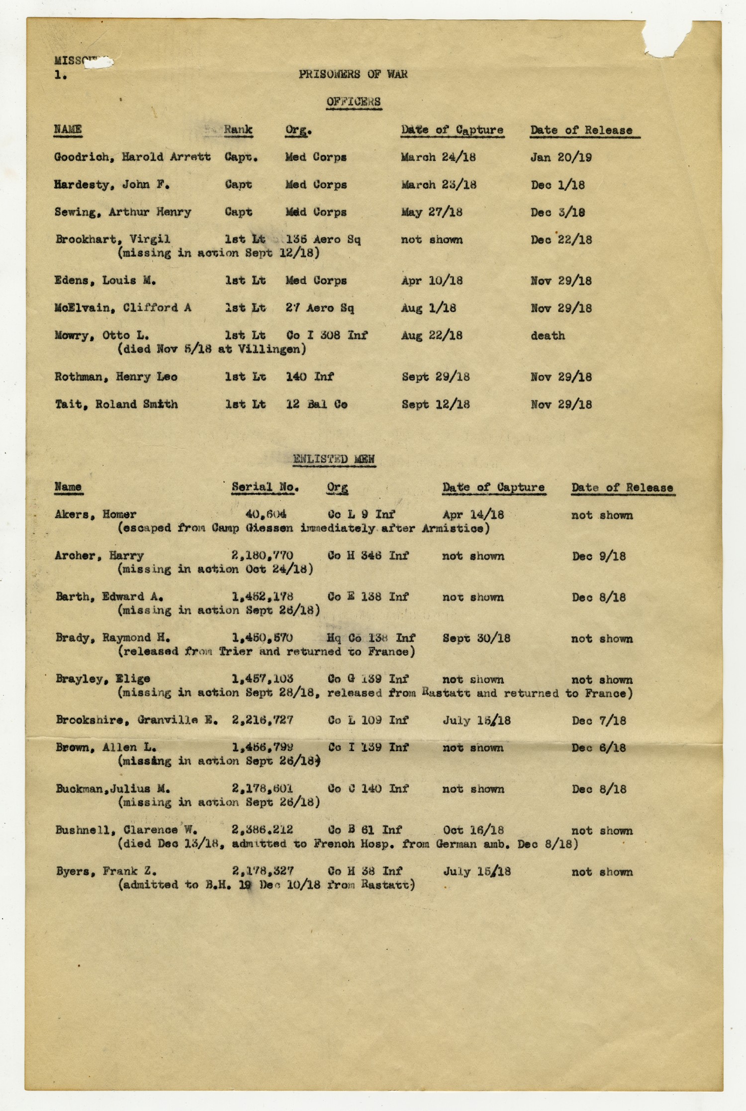 MISSOURI [page 1] PRIOSNERS OF WAR OFFICERS [NAME] Goodrich, Harold Arrett [Rank] Capt. [Org.] Med Corps [Date of Capture] March 24/[1918][Date of Release] [January] 20/[1919] [NAME] Hardesty, John F. [Rank] Capt [Org.] Med Corps [Date of Capture] March 23/[1918] [Date of Release] [December] 1/[1918] [NAME] Sewing, Arthur Henry [Rank] Capt [Org.] Med Corps [Date of Capture] May 27/[1918] [Date of Release] [December] 3.[1918] [NAME] Brookhard, Virgil (missing in action [September] 12/[1918]) [Rank] 1st Lt [Org.] 135 Aero Sq [Date of Capture] not shown [Date of Release] [December] 22/ [1918] [NAME] Edens, Louis M. [Rank] 1st Lt [Org.] Med Corps [Date of Capture] [April] 10/[1918] [Date of Release] [November] 29/[1918] [NAME] McElvain, Clifford A. [Rank] 1st Lt [Org.] 27 Aero Sq [Date of Capture] [August] 1/[1918] [Date of Release] [November] 29/[1918] [NAME] Mowry, Otto L. (died [November] 5/[1918] at Villingen) [Rank] 1st Lt [Org.] Co I 308 Inf [Date of Capture] [August] 22/[1918][Date of Release] death [NAME] Rothman, Henry Leo [Rank] 1st Lt [Org.] 140 Inf [Date of Capture] [September] 29/[1918] [Date of Release] [November] 29/[1918] [NAME] Tait, Roland Smith [Rank] 1st Lt [Org.] 12 Bal Co [Date of Capture] [September] 12/[1918] [Date of Release] [November] 29/[1918] ENLISTED MEN [NAME] Akers, Homer [Serial No.] 40,604 [Org.] Co L 9 Inf [Date of Capture] [April] 14/[1918] [Date of Release] not shown [NAME] Archer, Harry (missing in action [October] 24/[1918] [Serial No.] 2,180,770 [Org.] Co H 346 Inf [Date of Capture] Not shown [Date of Release] [December] 9/[1918] [NAME] Barth, Edward A. (missing in action [September] 26/[1918]) [Serial No.] 1,452,178 [Org.] Co E 138 Inf [Date of Capture] not shown [Date of Release] [December] 8/[1918] [NAME] Brady, Raymond H. (released from Trier and returned to France) [Serial No.] 1,450,570 [Org.] Hq Co 138 Inf [Date of Capture] [September] 30/[1918] [Date of Release] not shown [NAME] Brayley, Elige (missing in action [September] 28/[1918], released from Rastatt and returned to France) [Serial No.] 1,457,103 [Org.] Co G 139 Inf [Date of Capture] not shown [Date of Release] not shown [NAME] Brookshire, Granville E. [Serial No.] 2,216,727 [Org.] Co L 109 Inf [Date of Capture] July 15/[1918] [Date of Release] [December] 7/[1918] [NAME] Brown, Allen L. (missing in action [September] 26/[1918]) [Serial No.] 1,456,799 [Org.] Co I 139 Inf [Date of Capture] not shown [Date of Release] [December] 6/[1918] [NAME] Buckman, Julia M. (missing in action [September] 26/[1918]) [Serial No.] 2,178,601 [Org.] Co C 140 Inf [Date of Capture] not shown [Date of Release] [December] 8/[1918] [NAME] Bushnell, Clarence W. (died [December] 13/[1918], admitted to French Hosp. from German amb. [December] 8/[1918]) [Serial No.] 2,386,212 [Org.] Co B 61 Inf [Date of Capture] [October] 16/[1918] [Date of Release] not shown [NAME] Byers, Frank Z. (admitted to B.H. 19 [December] 10/1918 from Rastatt) [Serial No.] 2,178,327 [Org.] Co H 38 Inf [Date of Capture] July 15/[1918] [Date of Release] not shown