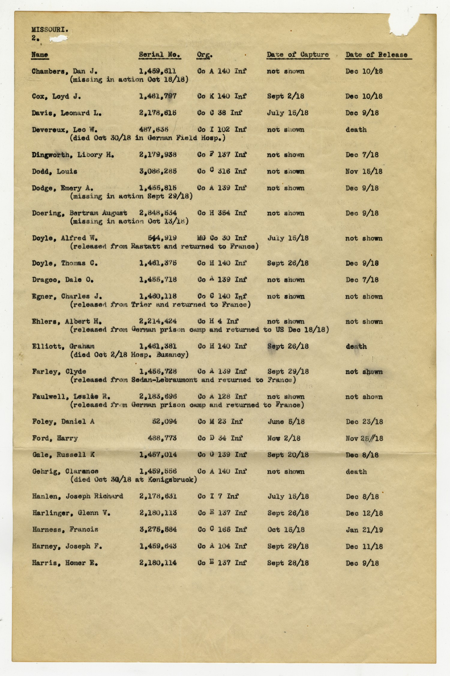 MISSOURI. [page 2] [NAME] Chambers, Dan J. (missing in action [October] 18/[1918] [Serial No.] 1,459,611 [Org.] Co A 140 Inf [Date of Capture] not shown [Date of Release] [December] 10/[1918] [NAME] Cox, Loyd J. [Serial No.] 1,461,797 [Org.] Co K 140 Inf [Date of Capture] [September] 2/[1918] [Date of Release] [December] 10/[1918] [NAME] Davis, Leonard L. [Serial No.] 2,178,615 [Org.] Co C 38 Inf [Date of Capture] July 15/[1918] [Date of Release] [December] 9/[1918] [NAME] Devereux, Leo W. (died [October] 30/[1918] in German Field Hosp.) [Serial No.] 487,635 [Org.] Co I 102 Inf [Date of Capture] not shown [Date of Release] death [NAME] Dingworth, Libory H. [Serial No.] 2,179,938 [Org.] Co F 137 Inf [Date of Capture] not shown [Date of Release] [December] 7/[1918] [NAME] Dodd, Louis [Serial No.] 3,086,285 [Org.] Co C 316 Inf [Date of Capture] not shown [Date of Release] [November] 15/[1918] [NAME] Dodge, Emery A. (missing in action [September] 29/[1918]) [Serial No.] 1,455,815 [Org.] Co A 139 Inf [Date of Capture] not shown [Date of Release] [December] 9/[1918] [NAME] Doering, Bertram August (missing in action [October]13/[1918]) [Serial No.] 2,848,534 [Org.] Co H 354 Inf [Date of Capture] not shown [Date of Release] [December] 9/[1918] [NAME] Doyle, Alfred W. (released from Rastatt and returned to France) [Serial No.] 544,919 [Org.] MG Co 30 Inf [Date of Capture] July 15/[1918] [Date of Release] not shown [NAME] Doyle, Thomas C. [Serial No.] 1,461,375 [Org.] Co H 140 Inf [Date of Capture] [September] 26/[1918] [Date of Release] [December]9/[1918] [NAME] Dragoo, Dale O. [Serial No.] 1,455,718 [Org.] Co A 139 Inf [Date of Capture] not shown [Date of Release] [December] 7/[1918] [NAME] Egner, Charles J. (released from Trier and returned to France) [Serial No.] 1,460,118 [Org.] Co C 140 Inft [Date of Capture] not shown [Date of Release] not shown [NAME] Ehlers, Albert H. (released from German prison camp and returned to US [December] 18/[1918]) [Serial No.] 2,214,424 [Org.] Co H 4 Inf [Date of Capture] not shown [Date of Release] not shown [NAME] Elliott, Graham (died [October] 2/[1918] Hosp. Buzancy) [Serial No.] 1,461,381 [Org.] Co H 140 Inf [Date of Capture] [September] 26/[1918] [Date of Release] death [NAME] Farley, Clyde (released from Sedan-Lebraumont and returned to France) [Serial No.] 1,456,728 [Org.] Co A 139 Inf [Date of Capture] [September] 29/[1918] [Date of Release] not shown [NAME] Faulwell, Leslie R. (released from German prison camp and returned to France) [Serial No.] 2,183,696 [Org.] Co A 128 Inf [Date of Capture] not shown [Date of Release] not shown [NAME] Foley, Daniel A [Serial No.] 52,094 [Org.] Co M 23 Inf [Date of Capture] June 5/[1918] [Date of Release] [December] 23/[1918] [NAME] Ford, Harry [Serial No.] 488,773 [Org.] Co D 34 Inf [Date of Capture] [November]2/[1918] [Date of Release] [November]25/[1918] [NAME] Gale, Russell K [Serial No.] 1,457,014 [Org.] Co G 139 Inf [Date of Capture] [September] 20/[1918] [Date of Release] [December] 8/[1918] [NAME] Gehrig, Clarence (died [October] 30/[1918 at Konigsbruck) [Serial No.] 1,459,556 [Org.] Co A 140 Inf [Date of Capture] not shown [Date of Release] death [NAME] Hanlen, Joseph Richard [Serial No.] 2,178,631 [Org.] Co I 7 Inf [Date of Capture] July 15/[1918] [Date of Release] [December]8/[1918] [NAME] Harlinger, Glenn V. [Serial No.] 2,180,113 [Org.] Co E 137 Inf [Date of Capture] [September] 26/[1918] [Date of Release] [December] 8/[1918] [NAME] Harness, Francis [Serial No.] 3,275,584 [Org.] Co C 165 Inf [Date of Capture] [October] 15/[1918] [Date of Release] [January] 21/[1919] [NAME] Harney, Jospeh F. [Serial No.] 1,459,643 [Org.] Co A 104 Inf [Date of Capture] [September] 29/[1918] [Date of Release] [December] 11/[1918] [NAME] Harris, Homer E. [Serial No.] 2,180,114 [Org.] Co E 137 Inf [Date of Capture] [September] 28/[1918] [Date of Release] [December] 9/[1918]