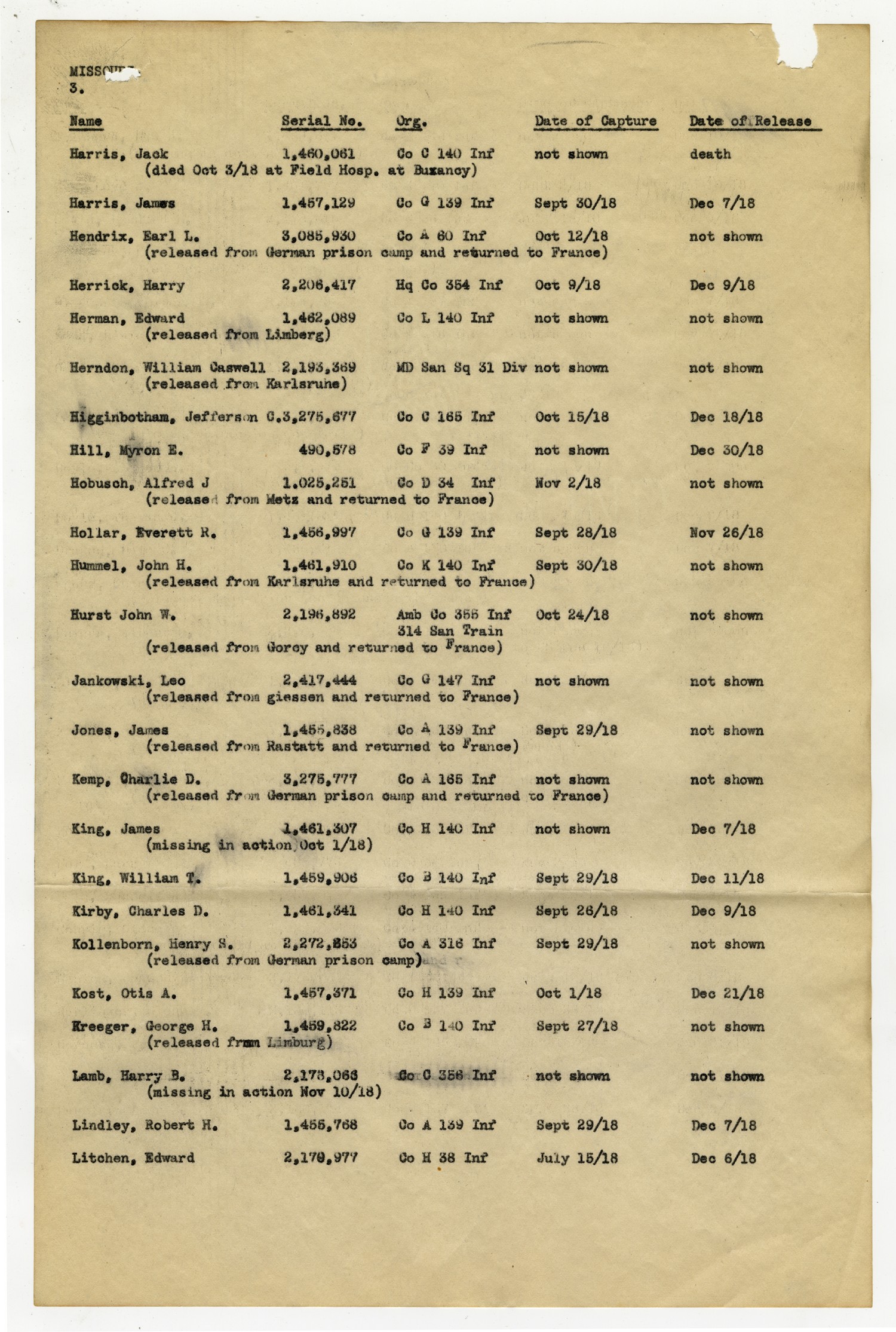 MISSOURI [page 3] [NAME] Harris, Jack (died [October] 3/[1918] at Field Hosp. at Buxancy) [Serial No.] 1,460,061 [Org.] Co C 140 Inf [Date of Capture] not shown [Date of Release] death [NAME] Harris, James [Serial No.] 1,457,129 [Org.] Co G 139 Inf [Date of Capture] [September] 30/[1918] [Date of Release] [December] 7/[1918] [NAME] Hendrix, Earl L. (released from German prison camp and returned to France) [Serial No.] 3,085,930 [Org.] Co A 60 Inf [Date of Capture] [October] 12/[1918] [Date of Release] not shown [NAME] Herrick, Harry [Serial No.] 2,206,417 [Org.] Hq Co 354 Inf [Date of Capture] [October] 9/[1918] [Date of Release] [December] 9/[1918] [NAME] Herman, Edward (released from Limberg) [Serial No.] 1,462,089 [Org.] Co L 140 Inf [Date of Capture] not shown [Date of Release] not shown [NAME] Herndon, William Caswell (released from Karlsruhe) [Serial No.] 2,193,369 [Org.] MD San Sq 31 Div [Date of Capture] not shown [Date of Release]not shown [NAME] Higginbotham, Jefferson C. [Serial No.] 3,275,677 [Org.] Co C 165 Inf [Date of Capture] [October] 15/[1918] [Date of Release] [December] 18/[1918] [NAME] Hill, Myron E. [Serial No.] 490,578 [Org.] Co F 39 Inf [Date of Capture] not shown [Date of Release] [December] 30/[1918] [NAME] Hobusch, Alfred J (released from Metz and returned to France) [Serial No.] 1,025,251 [Org.] Co d 34 Inf [Date of Capture] [November] 2/[1918] [Date of Release] not shown [NAME] Hollar, Everett R. [Serial No.] 1,456,997 [Org.] Co G 139 Inf [Date of Capture] [September] 28/[1918] [Date of Release] [November] 26/[1918] [NAME] Hummel, John H. (released from Karlsruhe and returned to France) [Serial No.] 1,461,910 [Org.] Co K 140 Inf [Date of Capture] [September] 30/[1918] [Date of Release] not shown [NAME] Hurst John W. (released from Gorcy and returned to France) [Serial No.] 2,196,892 [Org.] Amb Co 355 Inf 314 San Train [Date of Capture] [October] 24/[1918] [Date of Release] not shown [NAME] Jankowski, Leo (released from Giessen and returned to France) [Serial No.] 2,417,444 [Org.] Co G 147 Inf [Date of Capture] not shown [Date of Release] not shown [NAME] Jones, James (released from Rastatt and returned to France) [Serial No.] 1,455,838 [Org.] Co A 139 Inf [Date of Capture] [September] 29/[1918] [Date of Release] not shown [NAME] Kemp, Charlie D. (released from German prison camp and returned to France) [Serial No.] 3,275,777 [Org.] Co A 165 Inf [Date of Capture] not shown [Date of Release] not shown [NAME] King, James (missing in action [October] 1/[1918]) [Serial No.] 1,461,307 [Org.] Co H 140 Inf [Date of Capture] not shown [Date of Release] [December] 7/[1918] [NAME] King, William T. [Serial No.] 1,459,906 [Org.] Co B 140 Inf [Date of Capture] [September] 29/[1918] [Date of Release] [December] 11/[1918] [NAME] Kirby, Charles D. [Serial No.] 1,461,341 [Org.] Co H 140 Inf [Date of Capture] [September] 26/[1918] [Date of Release] [December] 9/[1918] [NAME] Kollenborn, Henry S. (released from German prison camp) [Serial No.] 2,272,353 [Org.] Co A 316 Inf [Date of Capture] [September] 29/[1918] [Date of Release] not shown [NAME] Kost, Otis A. [Serial No.] 1,457,371 [Org.] Co H 139 Inf [Date of Capture] [October] 1/[1918] [Date of Release] [December] 21/[1918] [NAME] Kreeger, George H. (released from Limburg) [Serial No.] 1,459,822 [Org.] Co B 140 Inf [Date of Capture] [September] 27/[1918] [Date of Release] not shown [NAME] Lamb, Harry B. (missing in action [November] 10/[1918]) [Serial No.] 2,178,066 [Org.] Co C 356 Inf [Date of Capture] not shown [Date of Release] not shown [NAME] Lindley, Robert H. [Serial No.]1,456,768 [Org.] Co A 139 Inf [Date of Capture] [September] 29/[1918] [Date of Release] [December] 7/[1918] [NAME] Litchen, Edward [Serial No.] 2,179,977 [Org.] Co H 38 Inf [Date of Capture] July 15/[1918] [Date of Release] [December] 6/[1918]