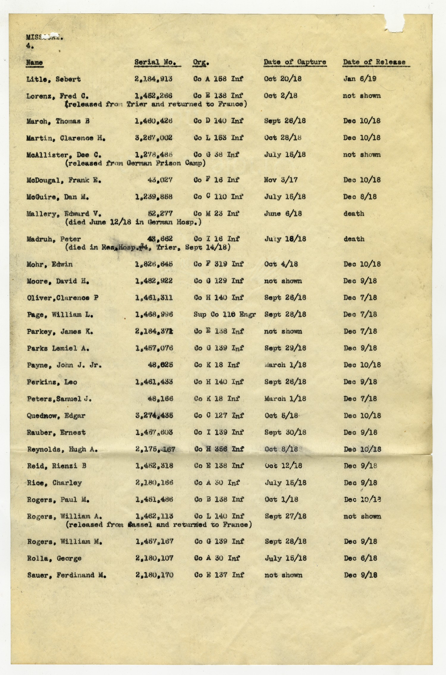 MISSOURI. [page 4] [NAME] Litle, Sebert [Serial No.] 2,184,913 [Org.] Co A 158 Inf [Date of Capture] [October] 20/[1918] [Date of Release] [January] 6/[1918] [NAME] Lorenz, Fred C. (released from Trier and returned to France) [Serial No.] 1,452,266 [Org.] Co E 138 Inf [Date of Capture] [October] 2/[1918] [Date of Release] not shown [NAME] March, Thomas B [Serial No.] 1,460,426 [Org.] Co D 140 Inf [Date of Capture] [September] 26/[1918] [Date of Release] [December] 10/[1918] [NAME] Martin, Clarence H. [Serial No.] 3,267,002 [Org.] Co L 153 Inf [Date of Capture] [October] 28/[1918] [Date of Release] [December] 10/[1918] [NAME] McAllister, Dee C. (released from German Prison Camp) [Serial No.] 1,278,486 [Org.] Co G 38 Inf [Date of Capture] July 15/[1918] [Date of Release] not shown [NAME] McDougal, Frank E. [Serial No.] 43,027 [Org.] Co F 16 Inf [Date of Capture] [November] 3/[1917] [Date of Release] [December] 10/[1918] [NAME] McGuire, Dan M. [Serial No.] 1,239,858 [Org.] Co C 110 Inf [Date of Capture] July 15/[1918] [Date of Release] [December] 8/[1918] [NAME] Mallery, Edward V. (died July 12/[1918] in German Hosp.) [Serial No.] 52,277 [Org.] Co M 23 Inf [Date of Capture] June 6/[1918] [Date of Release] death [NAME] Madruh, Peter (died in Res. Hosp. #4, Trier, [September] 14/[1918]) [Serial No.] 43,662 [Org.] Co I 16 Inf [Date of Capture] July 15/[1918] [Date of Release] death [NAME] Mohr, Edwin [Serial No.] 1,826,645 [Org.] Co F 319 Inf [Date of Capture] [October] 4/[1918] [Date of Release] [December] 10/[1918] [NAME] Moore, David H. [Serial No.] 1,482,922 [Org.] Co G 129 Inf [Date of Capture] not shown [Date of Release] [December] 9/[1918] [NAME] Oliver, Clarence P [Serial No.] 1,461,311 [Org.] Co H 140 Inf [Date of Capture] [September] 26/[1918] [Date of Release] [December] 7/[1918] [NAME] Page, William L. [Serial No.] 1, 468,996 [Org.] Sup Co 110 Engr [Date of Capture] [September] 28/[1918] [Date of Release] [December] 7/[1918] [NAME] Parkey, James K. [Serial No.] 2,184,371 [Org.] Co E 138 Inf [Date of Capture] not shown [Date of Release] [December] 7/[1918] [NAME] Parks Lemiel A. [Serial No.] 1,457,076 [Org.] Co G 139 Inf [Date of Capture] [September] 29/[1918] [Date of Release] [December] 9/[1918] [NAME] Payne, John J. Jr. [Serial No.] 48,025 [Org.] Co K 18 Inf [Date of Capture] March 1/[1918] [Date of Release] [December] 10/[1918] [NAME] Perkins, Leo [Serial No.] 1,461,433 [Org.] Co H 140 Inf [Date of Capture] [September] 26/[1918] [Date of Release] [December] 9/[1918] [NAME] Peters, Samuel J. [Serial No.] 48,166 [Org.] Co K 18 Inf [Date of Capture] March 1/[1918] [Date of Release] [December] 7/[1918] [NAME] Quednow, Edgar [Serial No.] 3,274,435 [Org.] Co C 127 Inf [Date of Capture] [October] 5/[1918] [Date of Release] [December] 7/[1918] [NAME] Rauber, Ernest [Serial No.] 1,457,603 [Org.] Co I 139 Inf [Date of Capture] [September] 30/[1918] [Date of Release] [December] 9/[1918] [NAME] Reynolds, Hugh A. [Serial No.] 2,175,167 [Org.] Co H 356 Inf [Date of Capture] [October] 8/[1918] [Date of Release] [December] 10/[1918] [NAME] Reid, Rienzi B [Serial No.] 1,452,318 [Org.] Co E 138 Inf [Date of Capture] [October] 12/[1918] [Date of Release] [December] 9/[1918] [NAME] Rice, Charley [Serial No.] 2,180,166 [Org.] Co A 30 Inf [Date of Capture] July 15/[1918] [Date of Release] [December] 9/[1918] [NAME] Rogers, Paul M. [Serial No.] 1,451,486 [Org.] Co B 138 Inf [Date of Capture] [October] 1/[1918] [Date of Release] [December] 10/[1918] [NAME] Rogers, William A. (released from [Kassel] and returned to France) [Serial No.] 1,462,113 [Org.] Co L 140 Inf [Date of Capture] [September] 27/[1918] [Date of Release] not shown [NAME] Rogers, William M. [Serial No.] 1,457,167 [Org.] Co G 139 Inf [Date of Capture] [September] 28/[1918] [Date of Release] [December] 9/[1918] [NAME] Rolla, George [Serial No.] 2,180,107 [Org.] Co A 30 Inf [Date of Capture] July 15/[1918] [Date of Release] [December] 6/[1918] [NAME] Sauer, Ferdinand M. [Serial No.] 2,180,170 [Org.] Co E 137 Inf [Date of Capture] not shown [Date of Release] [December] 9/[1918]