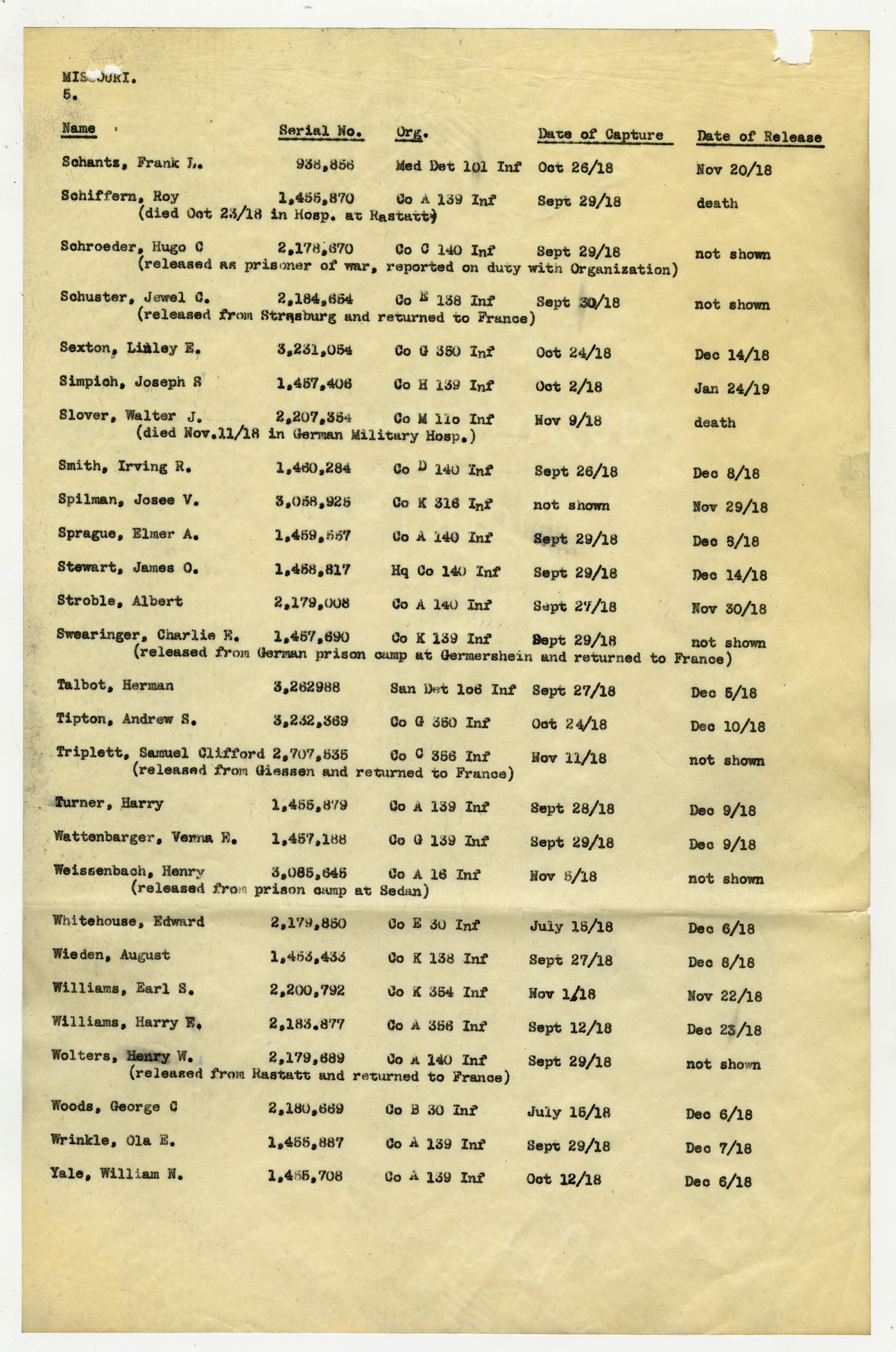 MISSOURI [page 5] [NAME] Schantz, Frank L. [Serial No.] 938,856 [Org.] Med Det 101 Inf [Date of Capture] [October] 26/[1918] [Date of Release] [November] 20/[1918] [NAME] Schiffern, Roy (died [October] 23/[1918 in Hosp. at Rastatt) [Serial No.] 1,455,870 [Org.] Co A 139 Inf [Date of Capture] [September] 29/[1918] [Date of Release] death [NAME] Schroeder, Hugo C (released as prisoner of war, reported on duty with Organization) [Serial No.] 2,178,670 [Org.] Co C 140 Inf [Date of Capture] [September] 29/[1918] [Date of Release] not shown [NAME] Schuster, Jewel G. (released from Strasburg and returned to France) [Serial No.] 2,184,654 [Org.] Co E 138 Infantry [Date of Capture] [September] 30/[1918] [Date of Release] not shown [NAME] Sexton, Linley E. [Serial No.] 3,231,054 [Org.] Co G 350 Inf [Date of Capture] [October] 24/[1918] [Date of Release] [December] 14/[1918] [NAME] Simpich, Joseph S [Serial No.] 1,457,406 [Org.] Co H 139 Inf [Date of Capture] [October] 2/[1918] [Date of Release][January]24/[1919] [NAME] Slover, Walter J. (died [November] 11/[1918] in German Military Hosp.) [Serial No.] 2,207,354 [Org.] Co M 118 Inf [Date of Capture] [November] 9/[1918] [Date of Release] death [NAME] Smith, Irving R. [Serial No.] 1,460,284 [Org.] Co D 140 Inf [Date of Capture] [September] 26/[1918] [Date of Release] [December] 8/[1918] [NAME] Spilman, Josee V. [Serial No.] 3,058,925 [Org.] Co K 316 Inf [Date of Capture] not shown [Date of Release] [November]29/[1918] [NAME] Sprague, Elmer A. [Serial No.] 1,459,557 [Org.] Co A 140 Inf [Date of Capture] [September] 29/[1918] [Date of Release] [December] 8/[1918] [NAME] Stewart, James O. [Serial No.] 1,458,817 [Org.] Hq Co 140 Inf [Date of Capture] [September] 29/[1918] [Date of Release] [December] 14/[1918] [NAME] Stroble, Albert [Serial No.] 2,179,008 [Org.] Co A 140 Inf [Date of Capture] [September] 27/[1918] [Date of Release] [November] 30/[1918] [NAME] Swearinger, Charlie E. (released from German prison camp at Germershein and returned to France) [Serial No.] 1,457,690 [Org.] Co K 139 Inf [Date of Capture] [September] 29/[1918] [Date of Release] not shown [NAME] Talbot, Herman [Serial No.] 3,262988 [Org.] San Det 186 Inf [Date of Capture] [September] 27/[1918] [Date of Release] [December] 5/[1918] [NAME] Tipton, Andrew S. [Serial No.] 3,232,369 [Org.] Co G 350 Inf [Date of Capture] [October] 24/[1918] [Date of Release] [December] 10/[1918] [NAME] Triplett, Samuel Clifford (released from Giessen and returned to France) [Serial No.] 2,707,535 [Org.] Co C 356 Inf [Date of Capture] [November] 11/[1918] [Date of Release] not shown [NAME] Turner, Harry [Serial No.] 1,455,879 [Org.] Co A 139 Inf [Date of Capture] [September] 28/[1918] [Date of Release] [December] 9/[1918] [NAME] Wattenbarger, Verna E. [Serial No.] 1,457,188 [Org.] Co G 139 Inf [Date of Capture] [September] 29/[1918] [Date of Release] [December] 9/[1918] [NAME] Weissenbach, Henry (released from prison camp at Sedan) [Serial No.] 3,085,645 [Org.] Co A 16 Inf [Date of Capture] [November] 5/[1918] [Date of Release] not shown [NAME] Whitehouse, Edward [Serial No.] 2,179,850 [Org.] Co E 30 Inf [Date of Capture] July 15/[1918] [Date of Release] [December] 6/[1918] [NAME] Wieden, August [Serial No.] 1,453,433 [Org.] Co K 138 Inf [Date of Capture] [September] 27/[1918] [Date of Release] [December] 8/[1918] [NAME] Williams, Earl S. [Serial No.] 2,200,792 [Org.] Co K 354 Inf [Date of Capture] [November] 1/[1918] [Date of Release] [November] 22/[1918] [NAME] Williams, Harry E. [Serial No.] 2,183,877 [Org.] Company A 356 Inf [Date of Capture] [September] 12/[1918] [Date of Release] [December] 25/[1918] [NAME] Wolters, Henry W. (released from Rastatt and returned to France) [Serial No.] 2,179,689 [Org.] Co A 140 Inf [Date of Capture] [September] 29/[1918] [Date of Release] not shown [NAME] Woods, George C [Serial No.] 2,180,669 [Org.] Co B 30 Inf [Date of Capture] July 15/[1918] [Date of Release] [December] 6/[1918] [NAME] Wrinkle, Ola E. [Serial No.] 1,455,887 [Org.] Co A 139 Inf [Date of Capture] [September] 29/[1918] [Date of Release] [December] 7/[1918] [NAME] Yale, William N. [Serial No.] 1,455,708 [Org.] Co a 139 Inf [Date of Capture] [October] 12/[1918] [Date of Release] [December] 6/[1918]