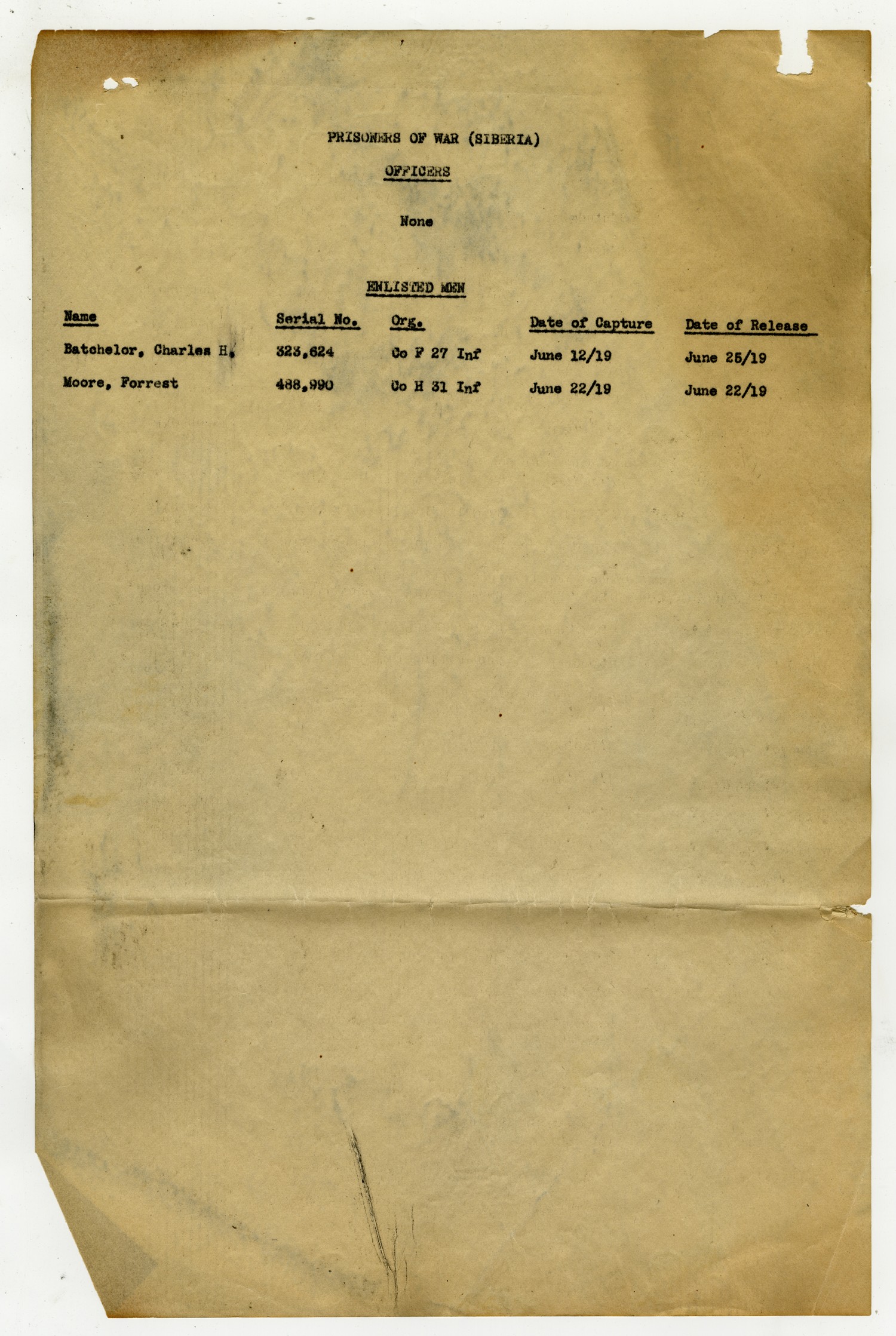 PRISONERS OF WAR (SIBERIA) OFFICERS None ENLISTED MEN [NAME] Batchelor, Charles H. [Serial No.] 323,624 [Org.] Co F 27 Inf [Date of Capture] June 12/[1919] [Date of Release] June 25/[1919] [NAME] Moore, Forrest [Serial No.] 488,990 [Org.] Co H 31 Inf [Date of Capture] June 22/[1919] [Date of Release] June 22/[1919]