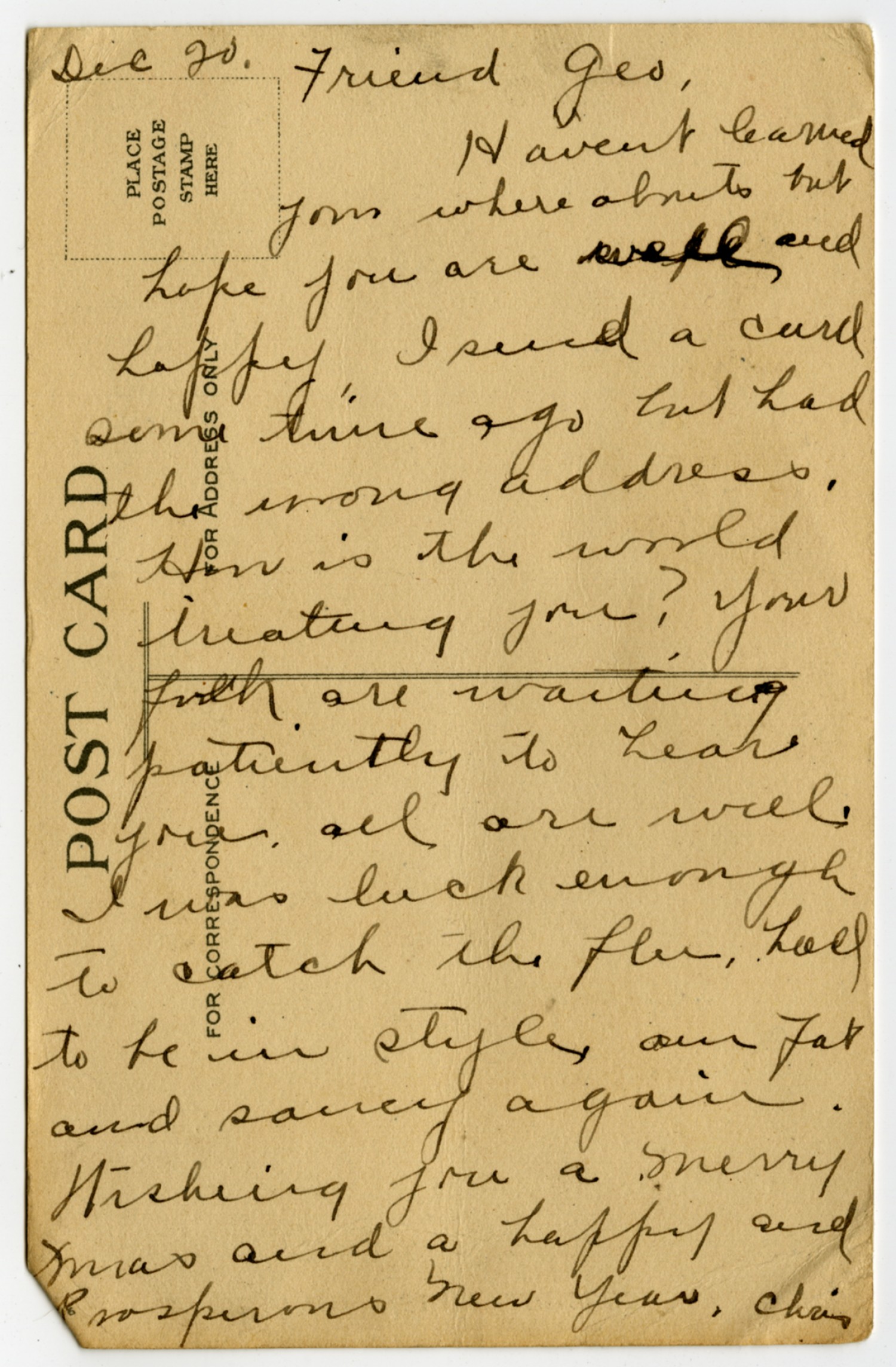 [December] 20. Friend geo, Havent learned your where abouts but hope you are well and happy. I send a card some time ago but had the wrong address. How is the world treating you? Your [ms illegible: 1 wd] are waiting patiently to hear you all are well. I was luck enough to catch the flu, had to be in style our fat and saucy again. Wishing you a merry Xmas and a happy and Prosperous New Year. Cha