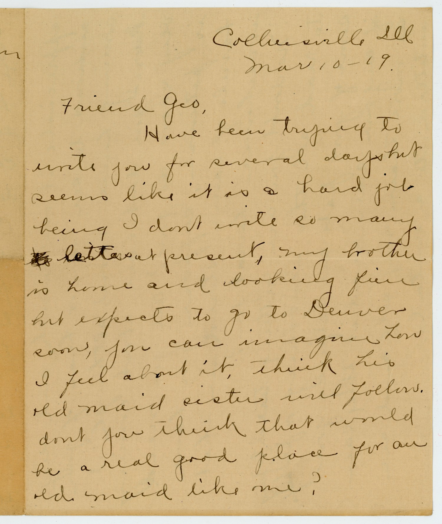 Collinsville, [Illinois] [March 10, 1919] Friend [George], Have been trying to write you for several days but seems like it is a hard job being I dont write so many letters at present, my brother is home and looking fine but expects to go to Denver soon, you can imagine how I feel about it, think his old maid sister will follow. dont you think that would be a real good place for an old maid like me?
