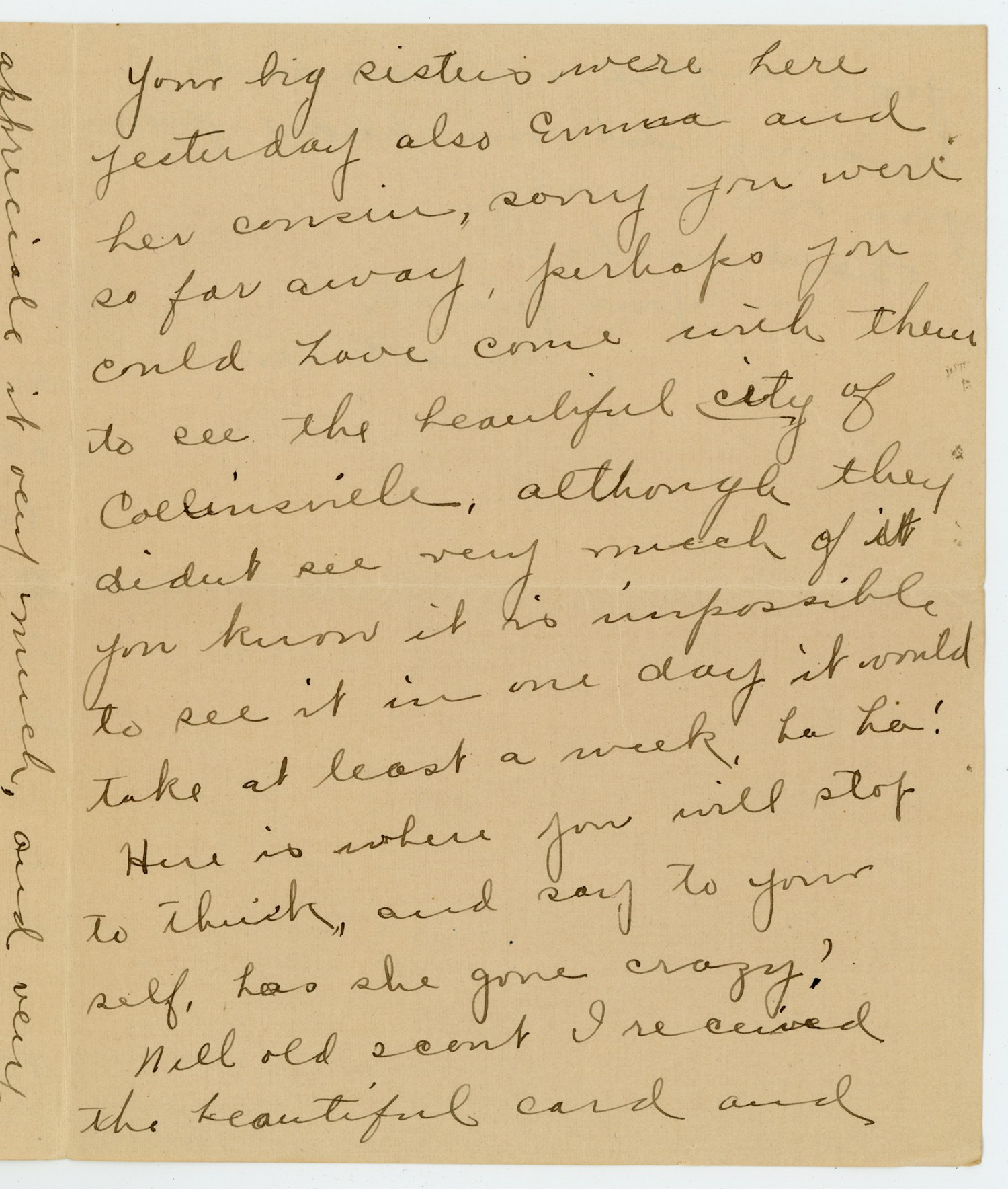 Your big sisters were here yesterday also Emma and her cousin, sorry you were so far away, perhaps you could have come with them to see the beautiful city of Collinsville. Although they didnt see very much of it you know it is impossible to see it in one day it would take at least a week. ha ha! Here is where you will stop to think, and say to your self, has she gone crazy? Well old [ms illegible: 1 wd] I received the beautiful card and