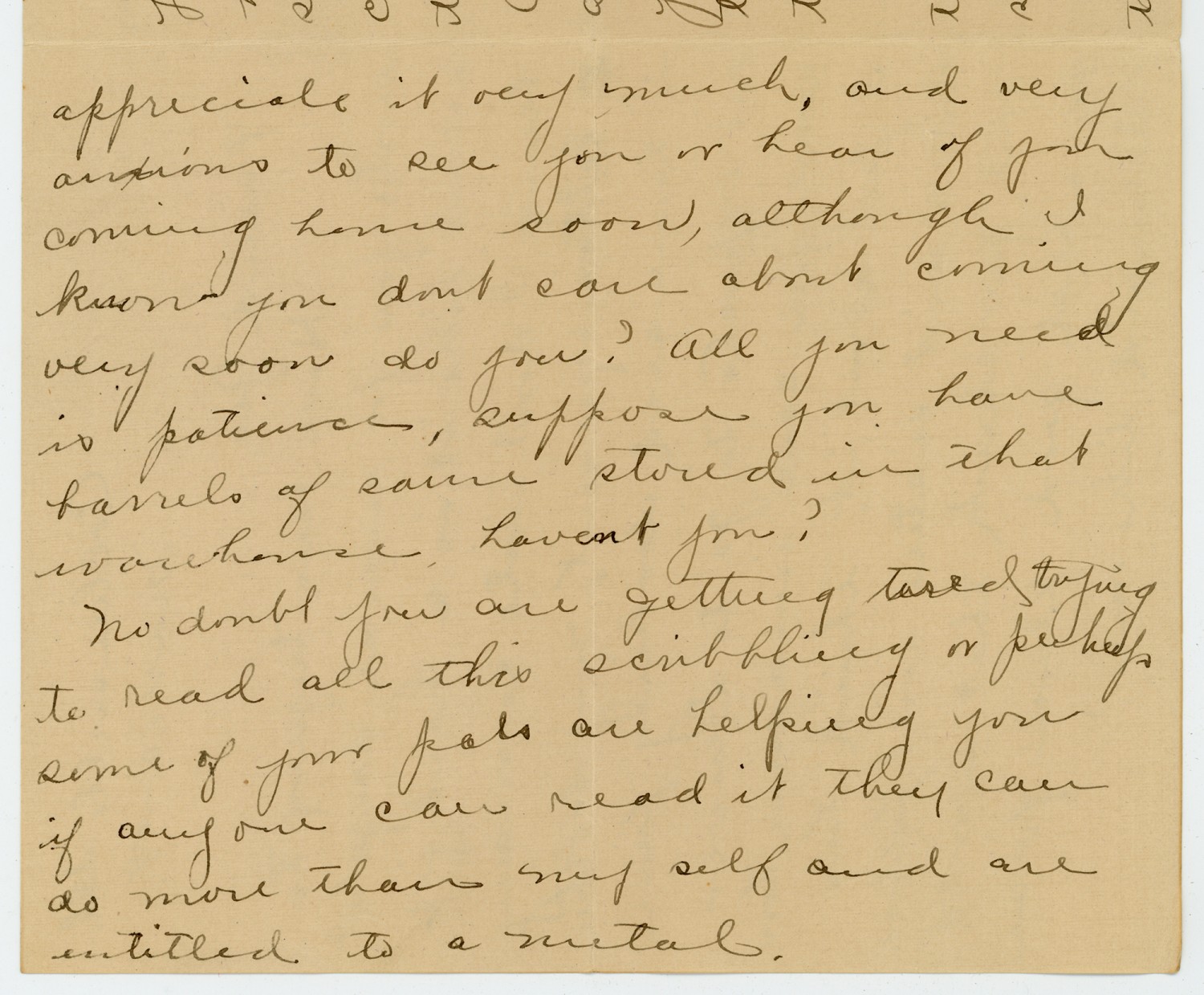 appreciate it very much, and very anxious to see you or hear of you coming home soon, although I know you dont care about coming very soon do you? All you need is patience, suppose you have barrels of same stored in that warehouse havent you? No doubt you are getting tired trying to read all this scribbling or perhaps some of your pals are helping you if anyone can read it they can do more than my self and are entitled to a metal.