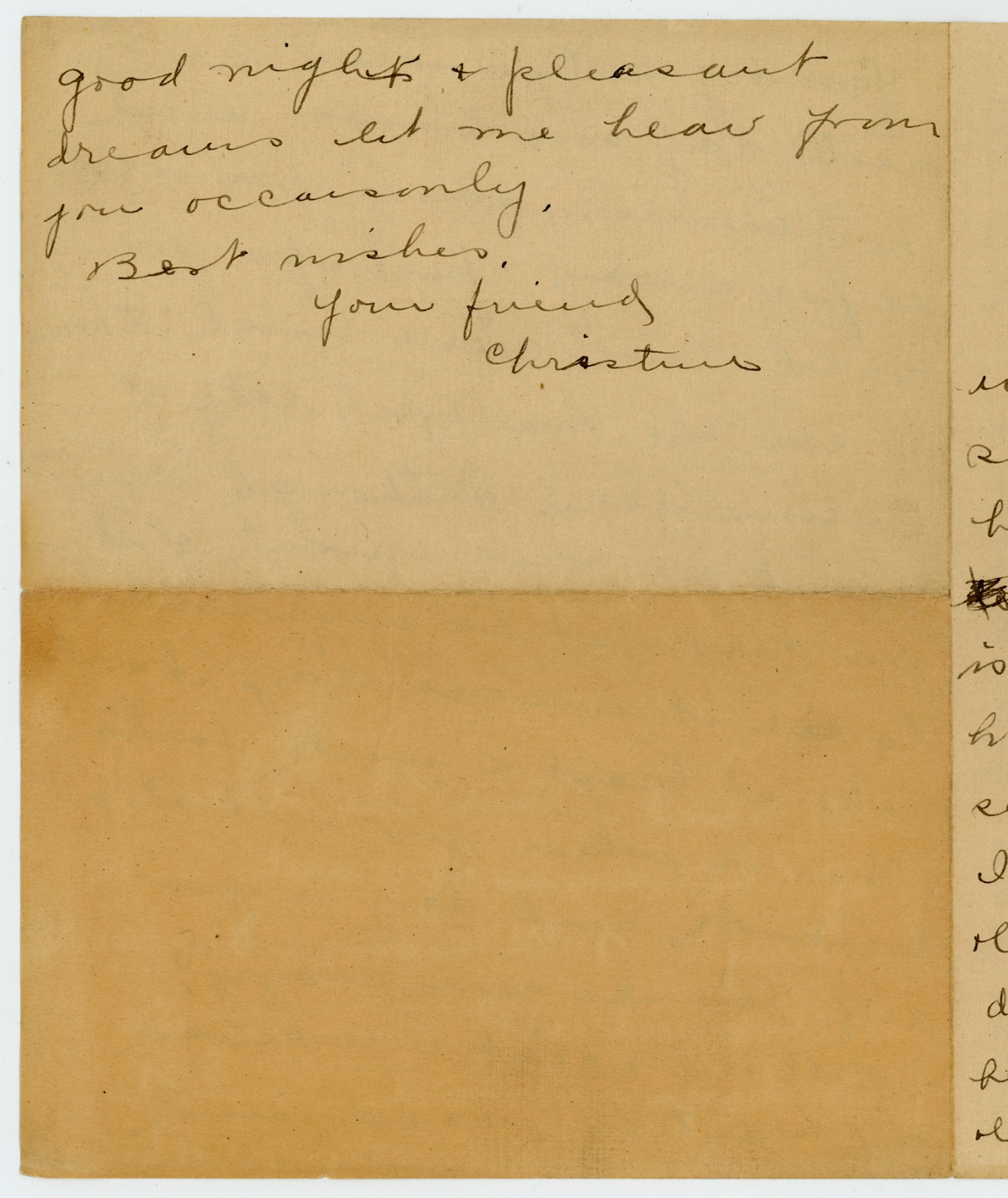 good night & pleasant dreams let me hear from you occaisonly. Best wishes, Your friend Christine