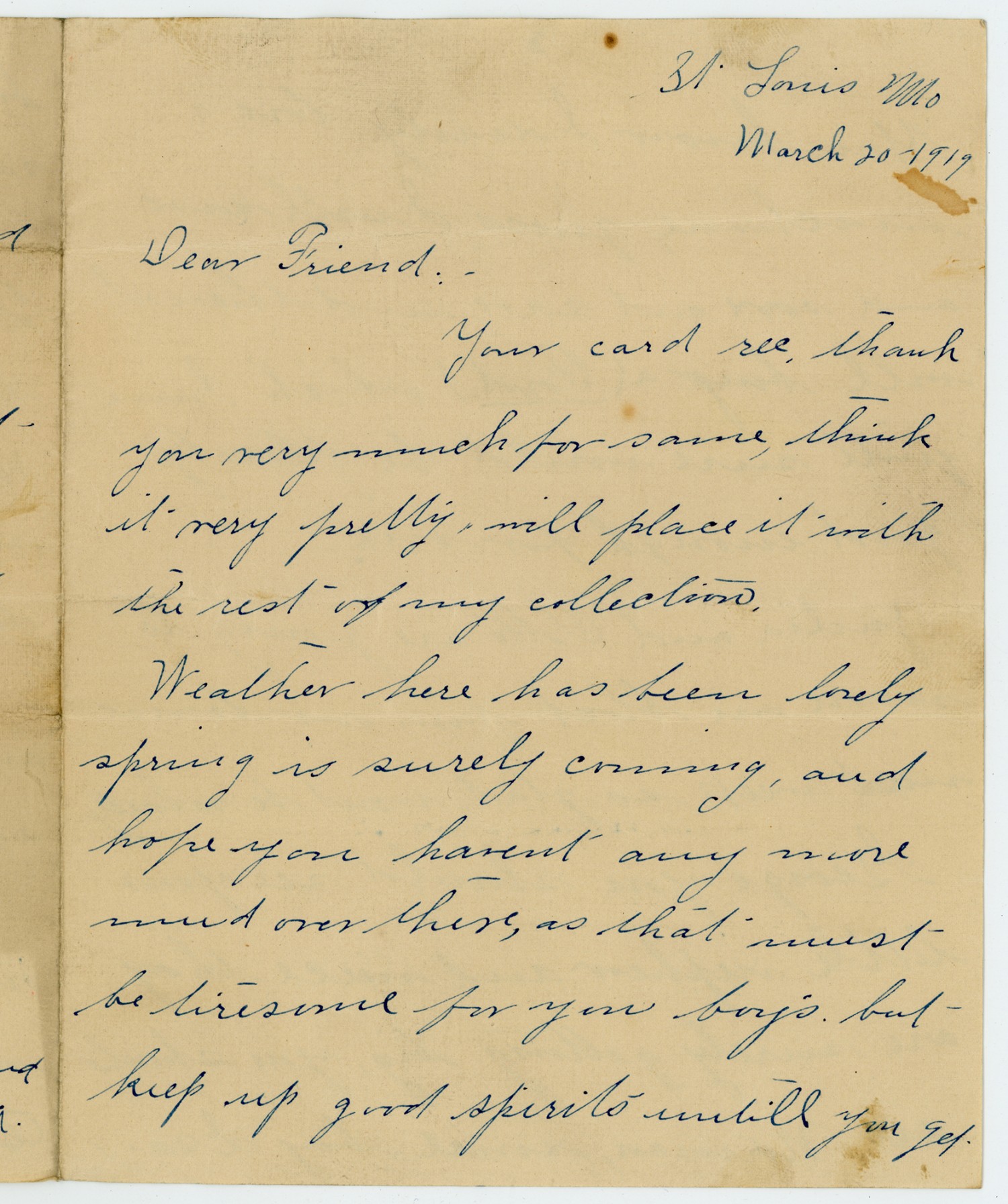 St. Louis [Missouri] March 20 - 1919 Dear Friend: - Your card rec, thank you very much for same, think it very pretty, will place it with the rest of my collection. Weather here has been lovely spring is surely coming, and hope you havent any more mud over there, as that must be tiresome for you boys but keep up good spirits untill you get