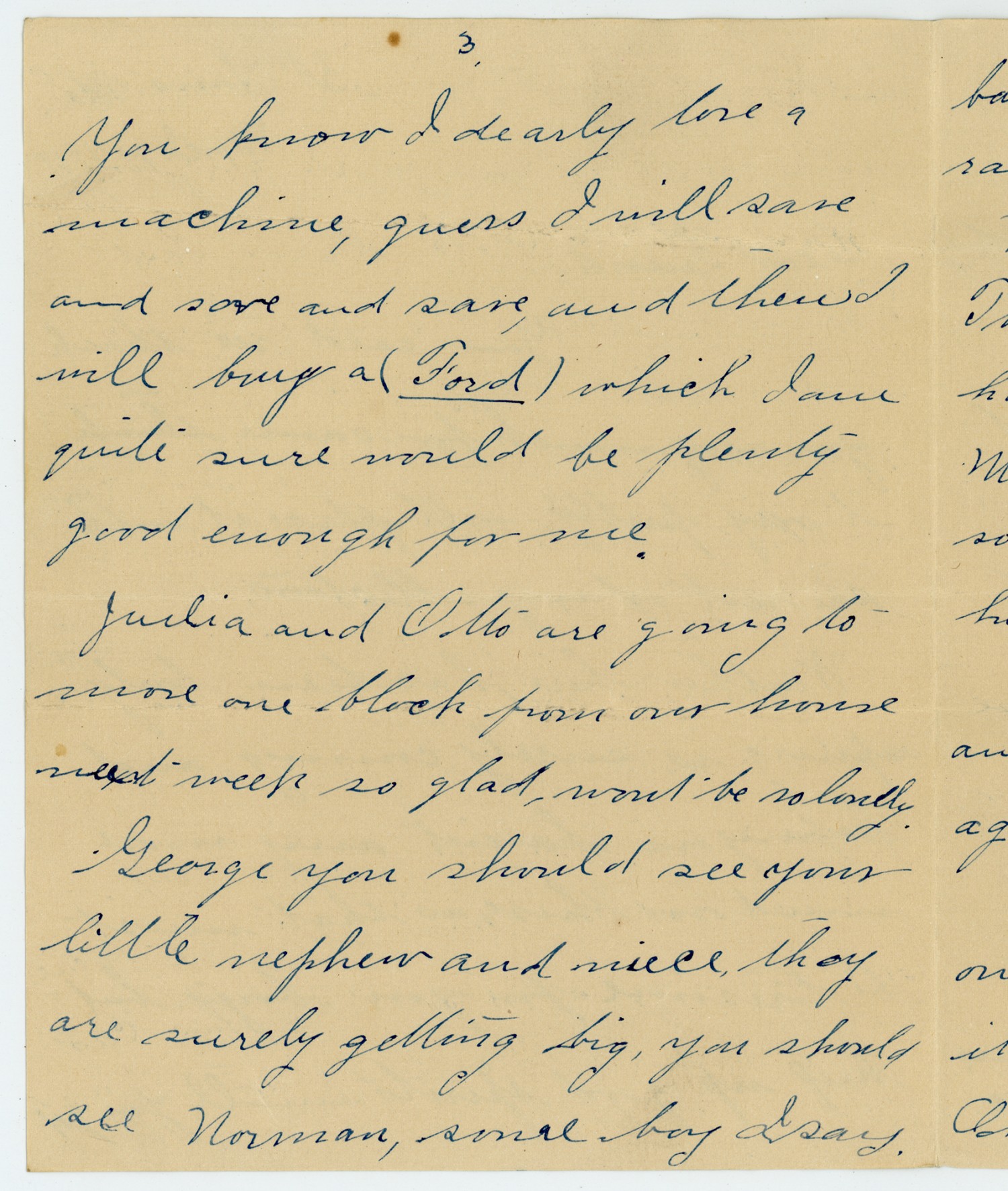 [page 3] You know I dearly love a machine, guess I will save and save and save, and then I will buy a (Ford) which I am quite sure would be plenty good enough for me. Julia and Otto are going to move one block from our house next week so glad, wont be so lonely. George you should see your little nephew and niece, They are surely getting big, you should see Norman, some boy I say