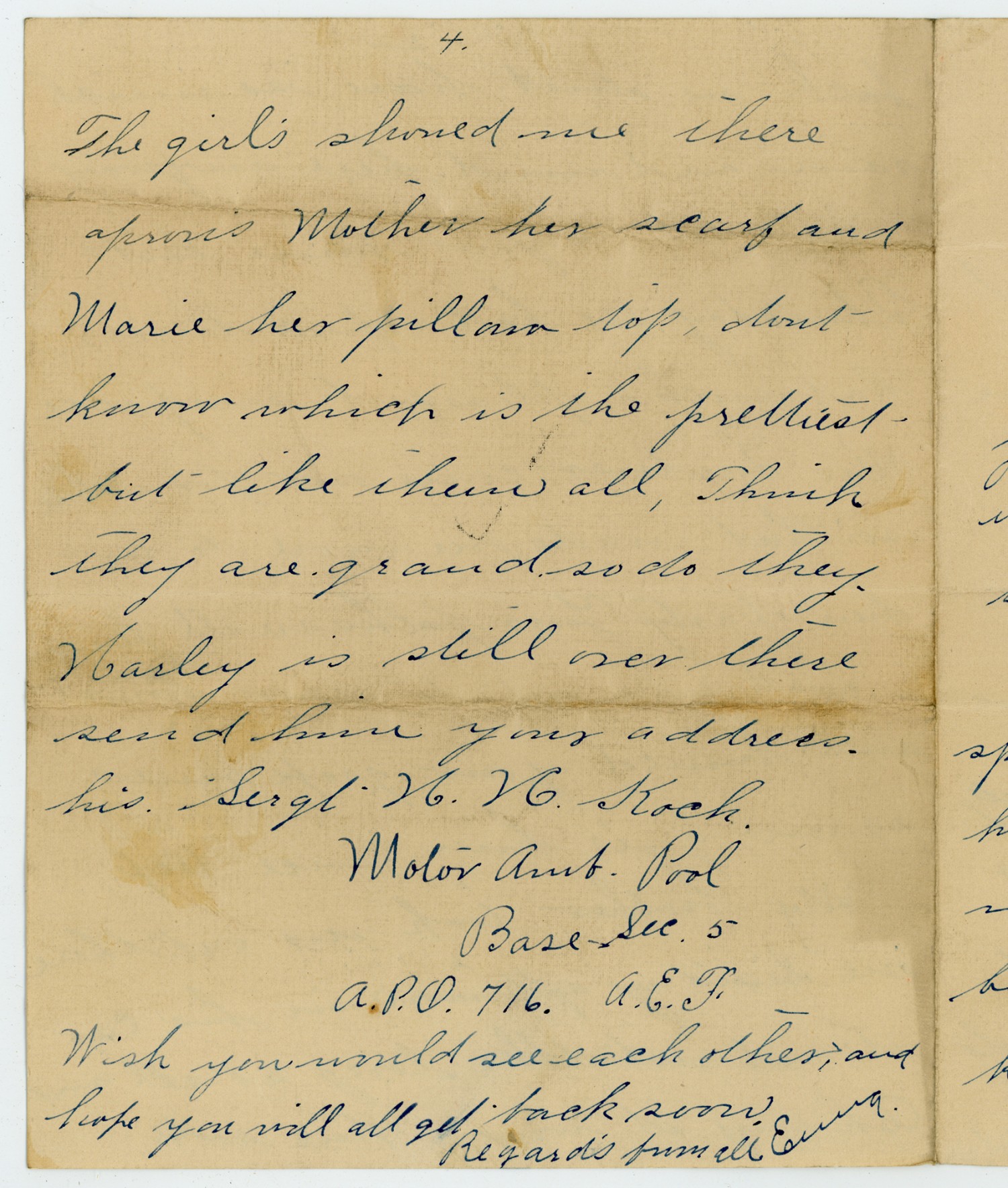 [page 4] The girls showed me there aprons Mother her scarf and Marie her pillow top, dont know which is the prettiest but like them all, Think they are grand and so do they. Harley is still over there send him your address. his Sergt. H. H. Koch. Motor Amt. Pool Base Sec. 5 A.P.O. 716 A.E.F. Wish you would see each other, and hope you will get back soon Regards from all Ewing
